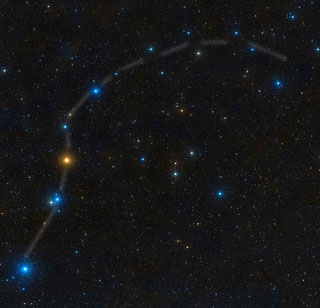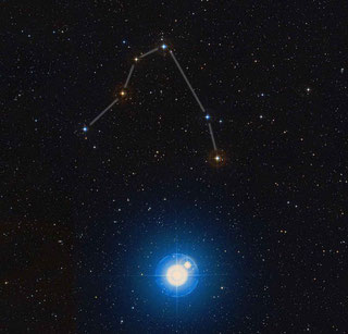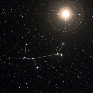 die Sterne von Zubs Hut sind sehr schwach zu erkennen, fünf direkt, einer indirekt - ein Pfeil, der nach Norden zeigt |