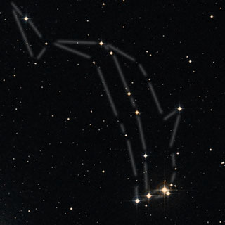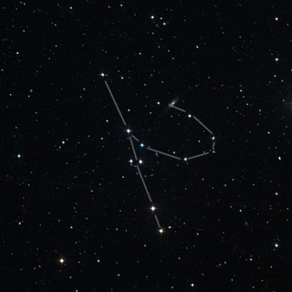 einige annähernd gleichhelle Sterne bilden einen lockeren Haufen - eine Spur aus 6 Sternen am Westrand wirkt wie der bogen im Sternbild Orion - im Inneren viele geometrische Muster, wie Rauten, Becher etc. |