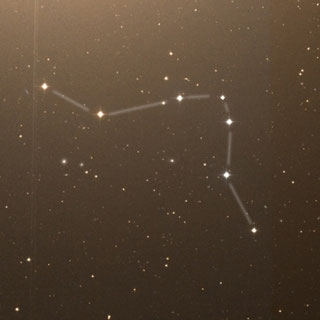 direkt besehen fallen vier Sterne auf, die wie ein liegendes spiegelverkehrtes L angeordnet sind - indirekt kommen noch zwei schwächere Sterne hinzu, die aus dem L eine seitenrichtige 4 machen |