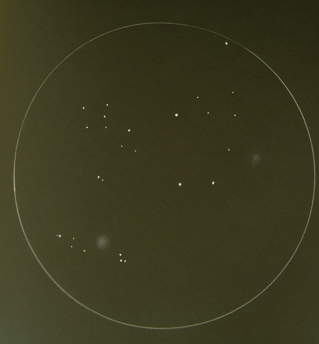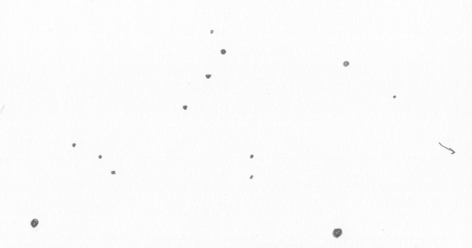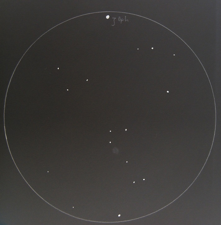 eine leicht höhere Konzentration schwacher Lichtpünktchen - der Haufen wirkt am besten indirekt besehen - auffallend ist ein Sternbogen, der sich nach Nordosten beugt - noch nicht spektakulär |