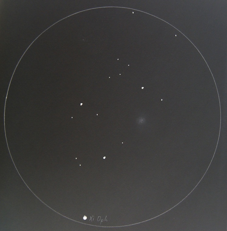 der Kugelsternhaufen blitzt indirekt immer wieder als schwache, leichte Aufhellung - er wirkt ein bisschen mehr als kompakt - schwer, aber nicht zu schwer |