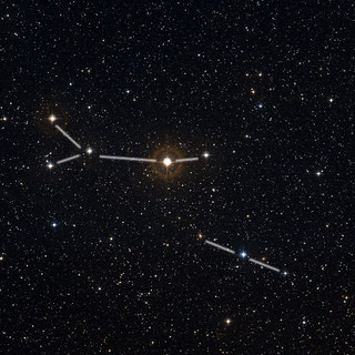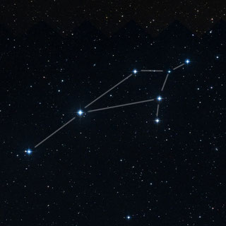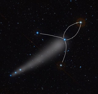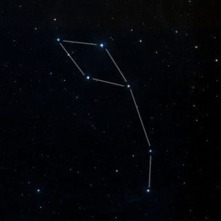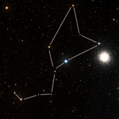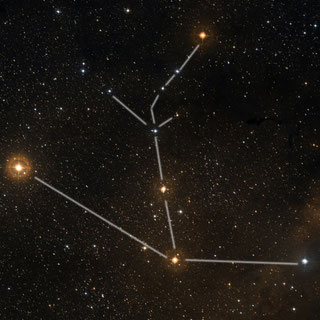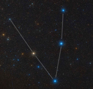 drei hellere Sterne bilden die westliche Flanke, von der einige schwächere Sterne wie ein Fähnchen nach Südosten wehen |