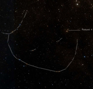 von Roslund 3 ist natürlich nichts zu sehen, aber die umgebenden Sterne, die dem Haufen fälschlicherweise den Namen Snail Cluster eingebracht haben, sind als kleine neblige Verdichtung erkennbar - indirekt zeigen sich die Einzelsterne das Hauses und des Kopfes |