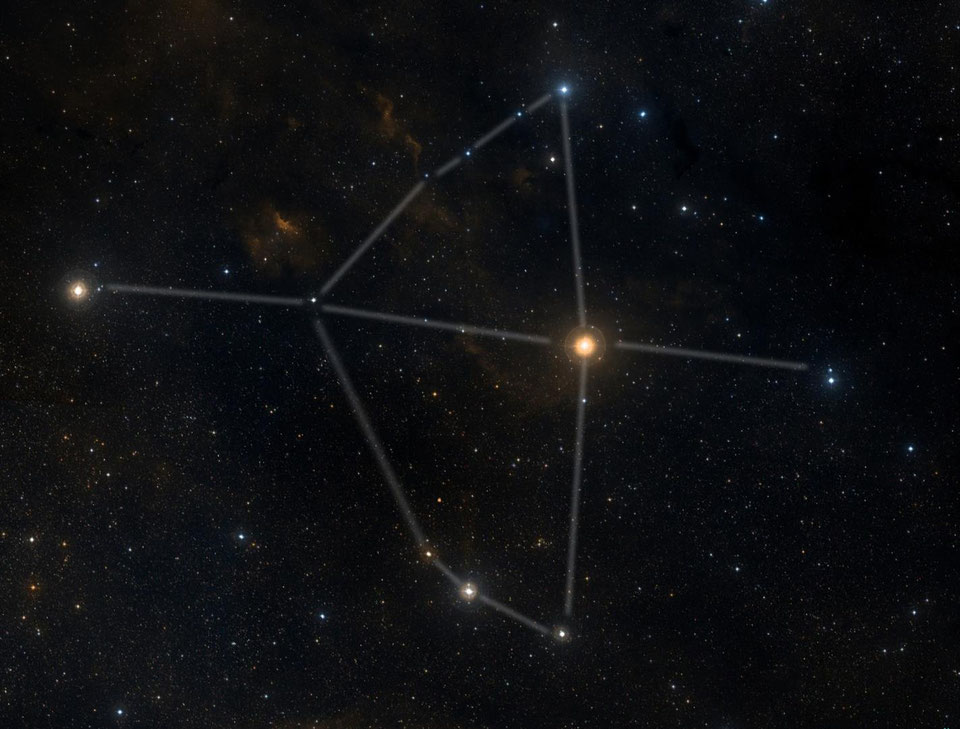 erster Eindruck: ein riesiges flaches Dreieck - bei näherer Betrachtung bilden die Sterngruppierungen viel geometrische Formen - gut zwei Dutzend Sterne mit ähnlicher Helligkeit - höchste Konzentration im Westen, wo auch eine prägnante Doppelsternspur mit vier Sternpaaren verläuft |