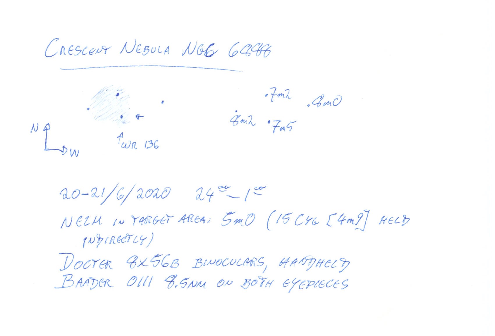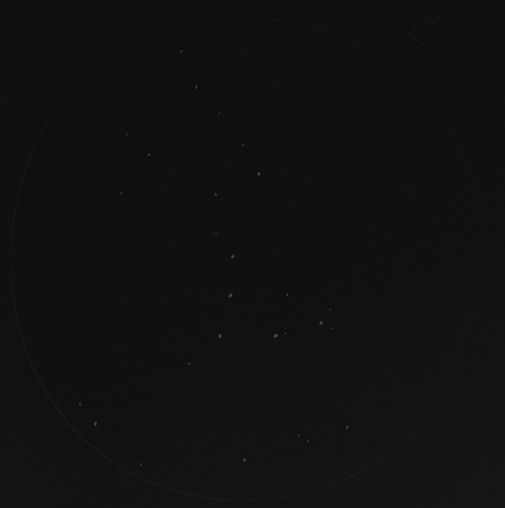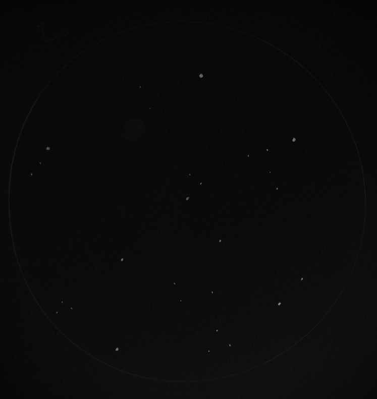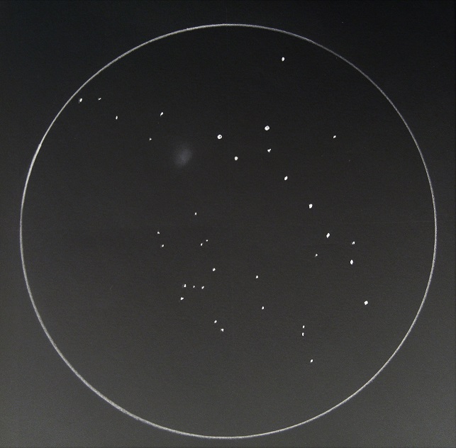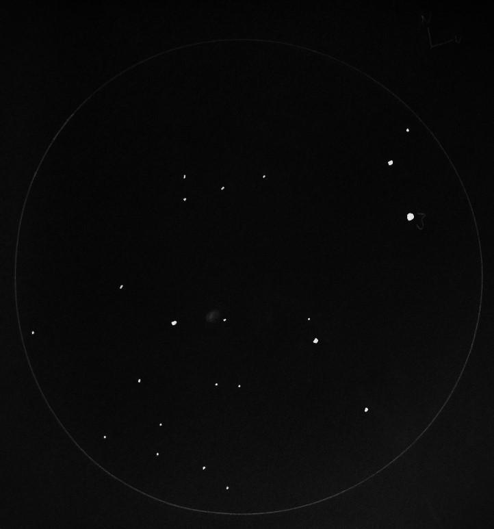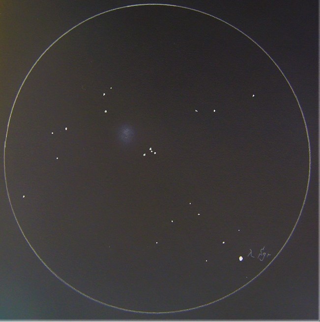 Bedingungen in der Zielregion: SQM-L 20.8 nordwestlich von einem schwachen Stern ist ganz zarter Sterngriesel erkennbar - der Haufen wirkt wie ein Kelch - indirekt sind die begrenzenden Sterne besser sichtbar |