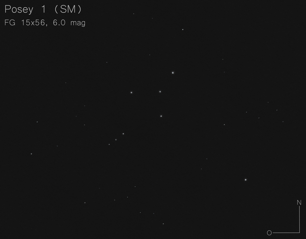 eine lockere Ansammlung relativ gleich heller Sterne spitz nach Norden zusammenlaufend - an der westlichen Flanke bilden einige Sternpaare je nach Ansicht einen Schienenstrang oder zwei längliche Rechtecke, die parallel verlaufen - der Südosten ist etwas weniger aufgeräumt - gut 20 Mitglieder sind erkennbar - ein schönes FG-Objekt |