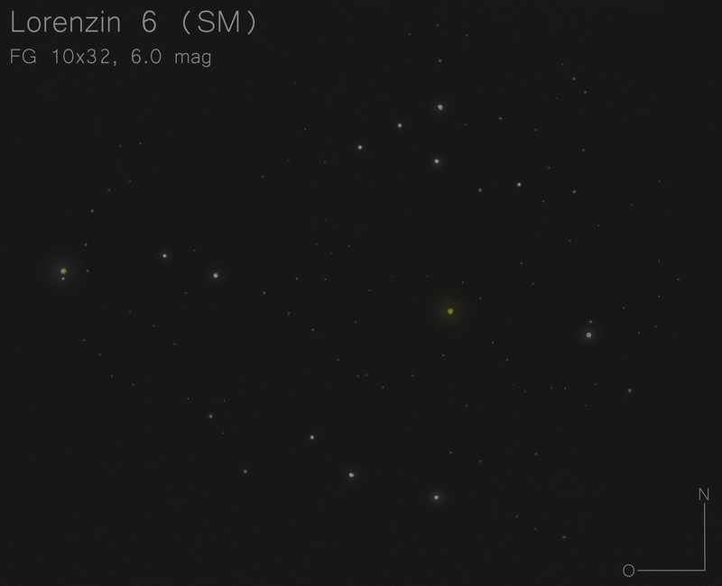 ein halbes Dutzend Sterne ist direkt auffällig - bei genauerer Betrachtung gibt es noch einige schwächere Sterne, die vorrangig zwischen den beiden hellsten Sternen herumwuseln - insgesamt besehen eher unauffällig die Sterngruppierung |