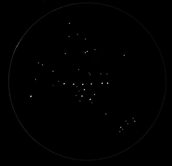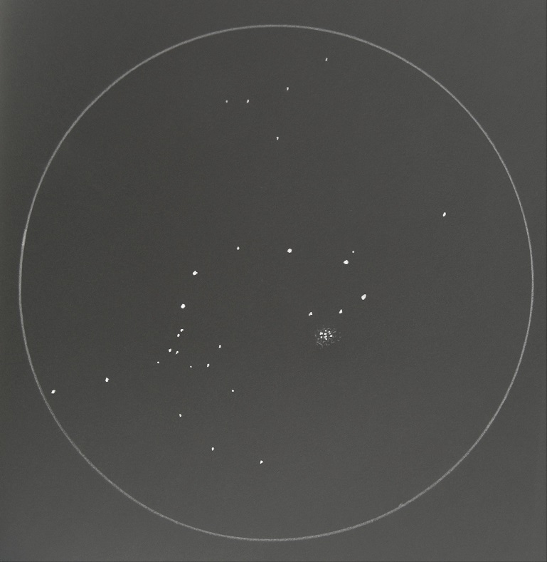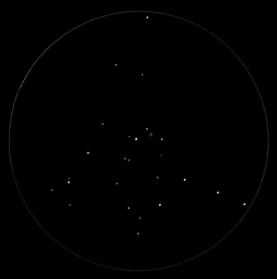 Sehr groß, relativ auffällig. Nach kurzem Einsehen ist die Ähnlichkeit zu den Plejaden erkennbar. Passt noch recht gut in das ca. 7.5° große Gesichtsfeld. |