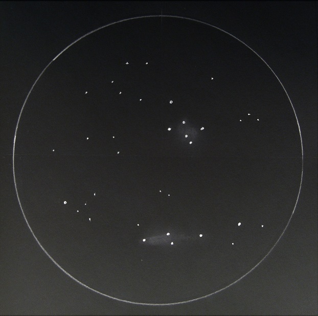 wenn man die drei Sterne südlich in einer Linie als Ausgangspunkt nimmt, wirkt der Haufen dreieckig - indirekt besehen ist der Haufen als längliche, neblige Verdichtung oberhalb der drei helleren Sterne erkennbar - zwei, drei schwächere Sterne blinken in dieser Verdichtung ab und an vor |