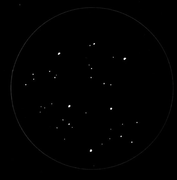 unauffällig - gut sieben bis acht Sterne in nordsüdlicher Ausrichtung sind erkennbar - der Haufen ist recht groß aber hebt sich kaum vom Umfeld ab |