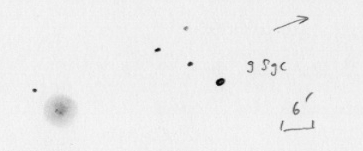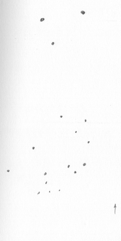 Auffällige, recht große Sterngruppe. Etwa zwei Dutzend Sterne waren sichtbar, die sich vorwiegend im Westen bogenförmig gen Norden laufend anordnen. Im Zentrum befinden sich noch zwei markante Sterne. Der westliche Stern ist der Doppelstern AG423, den ich aber aufgrund des sehr schwachen 11m3 Begleiters nicht trennen konnte. |