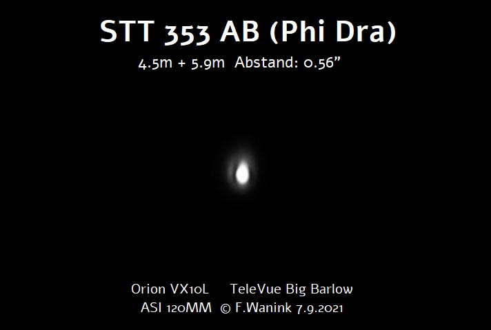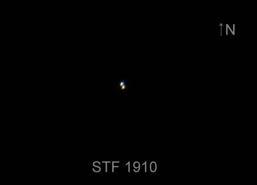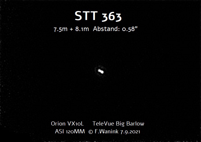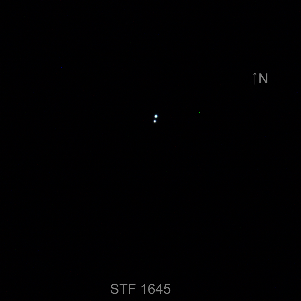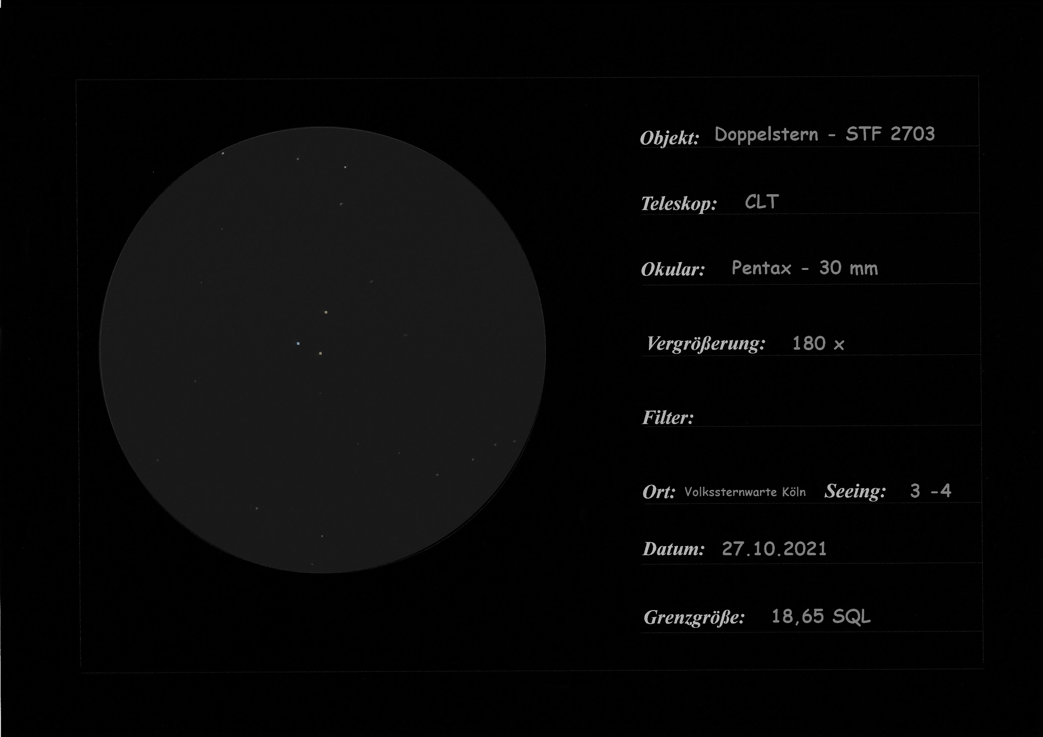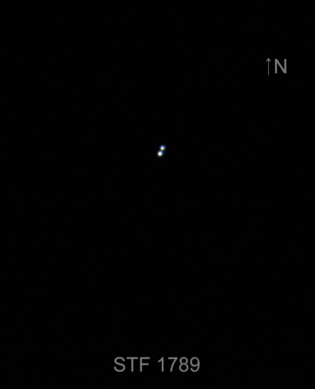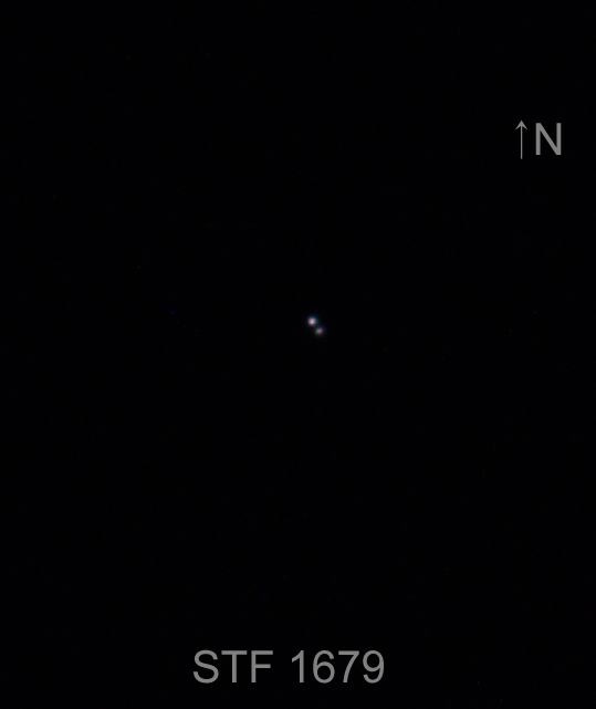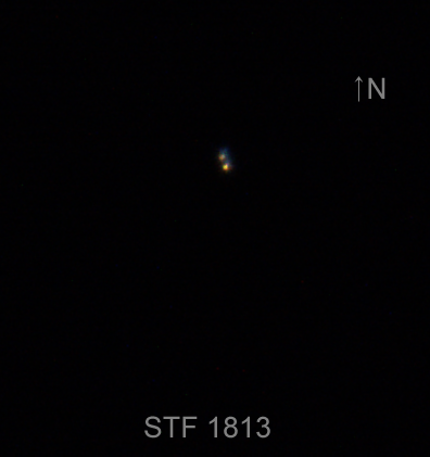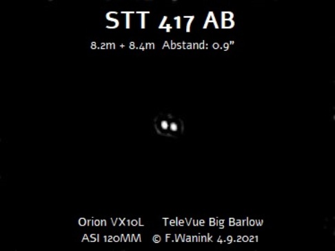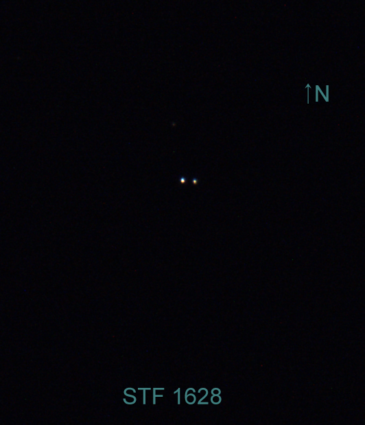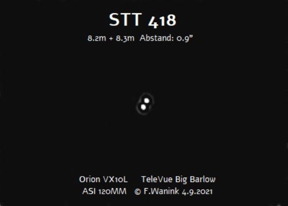 AB: 14.09.2021: Einfach trennbar bei moderatem Abstand und deutlichem Helligkeitsunterschied. Die Hauptkomponente wirkte gelblich, der schwache Begleiter war nur indirekt sichtbar. |