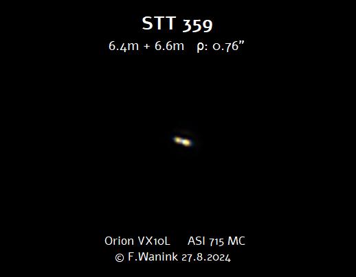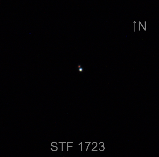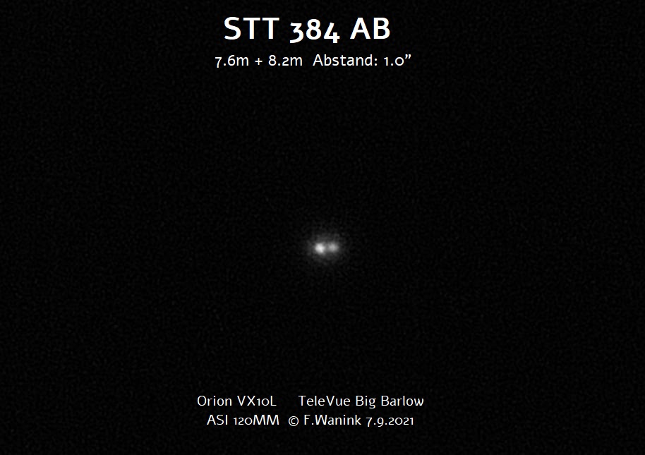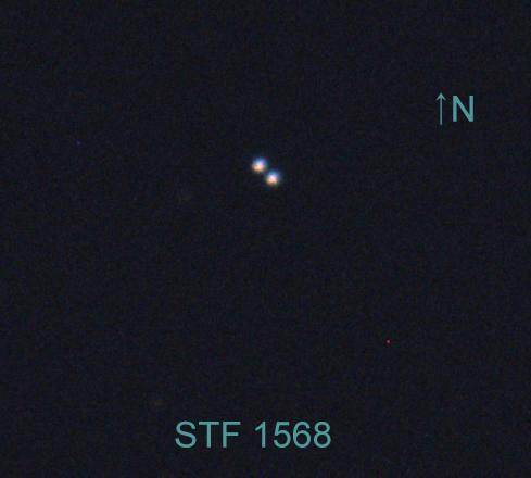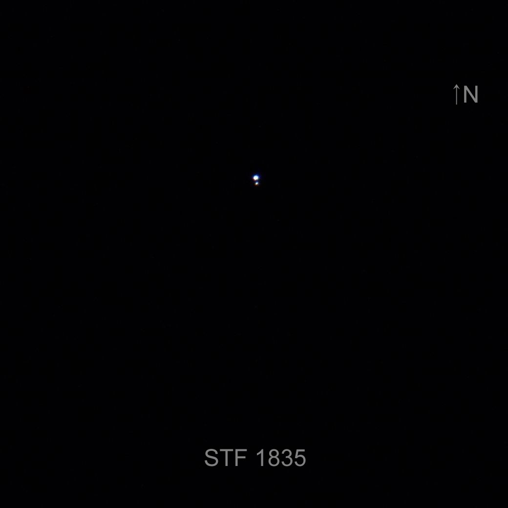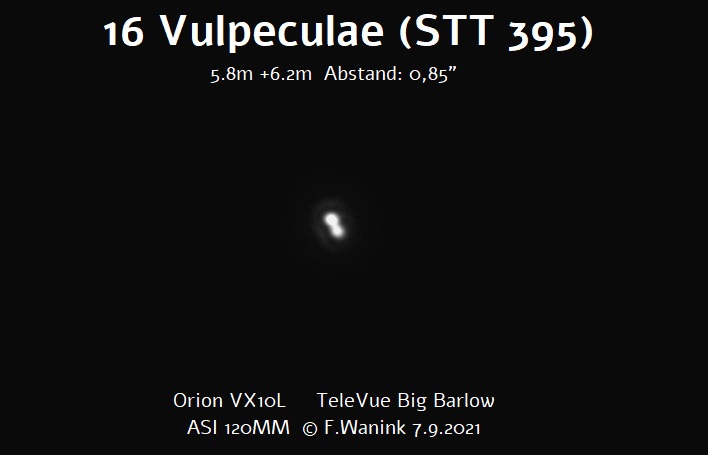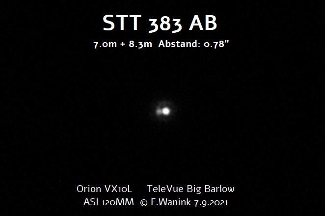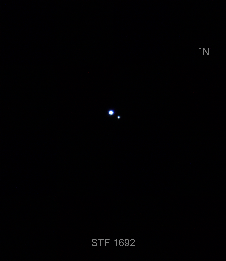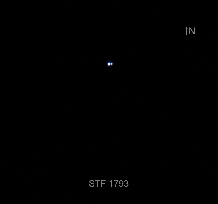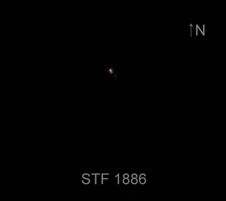 AB: 14.09.2021: Einfach trennbar bei moderatem Abstand und deutlichem Helligkeitsunterschied. Die Hauptkomponente wirkte gelblich, der schwache Begleiter war nur indirekt sichtbar. |