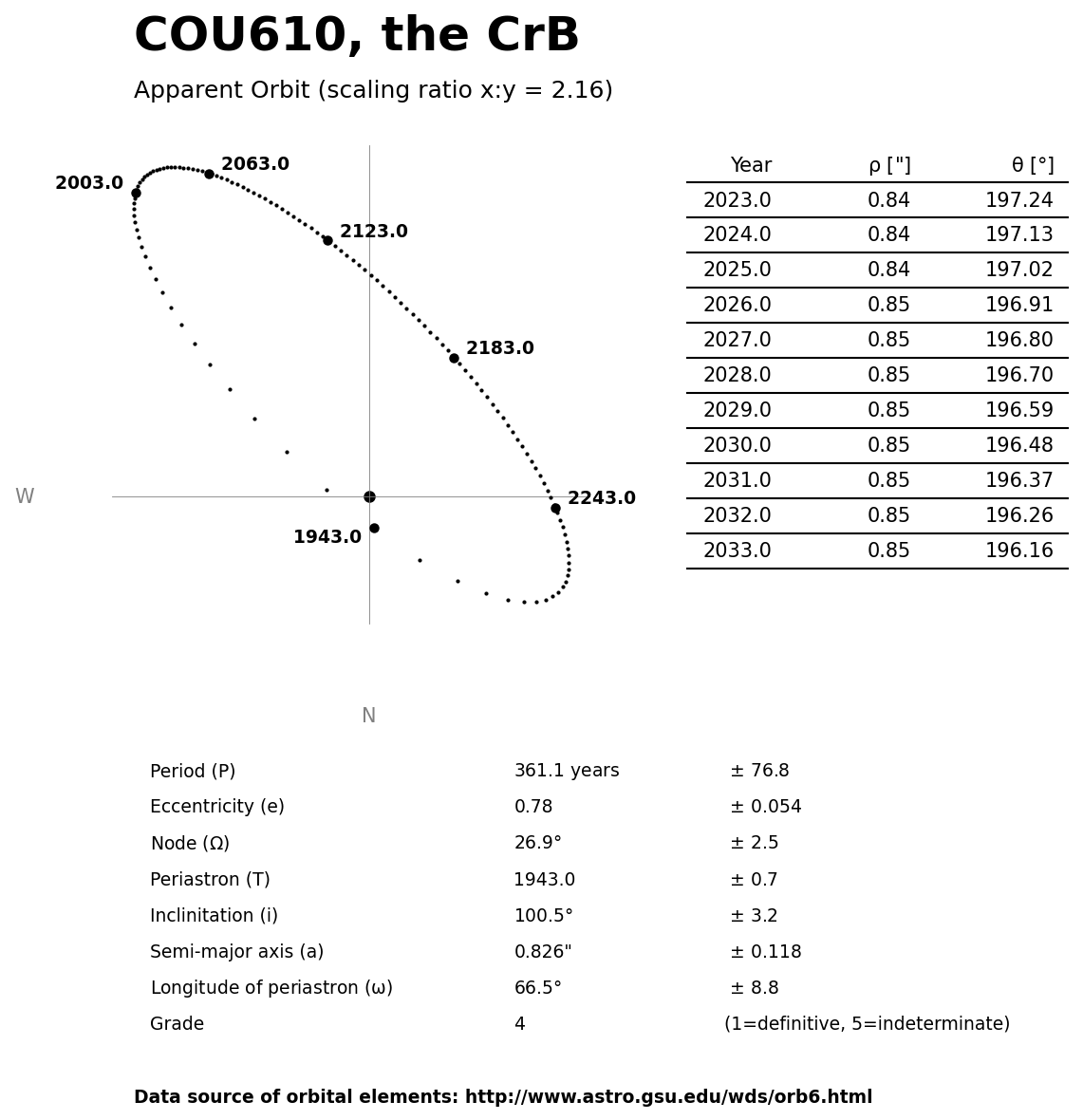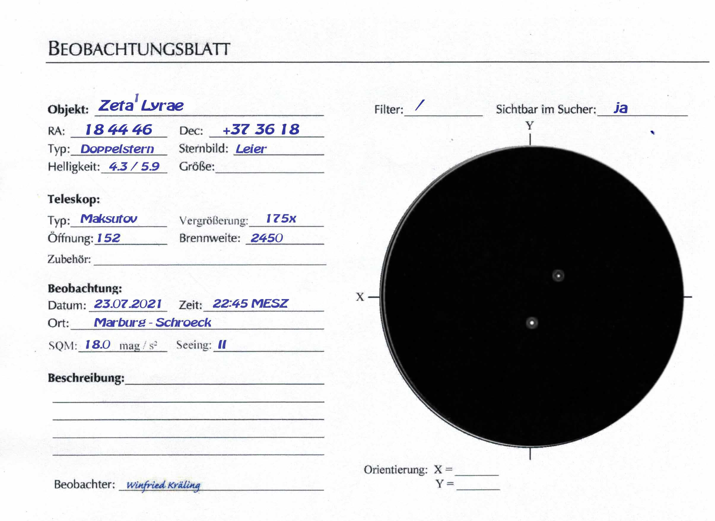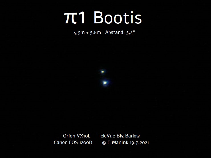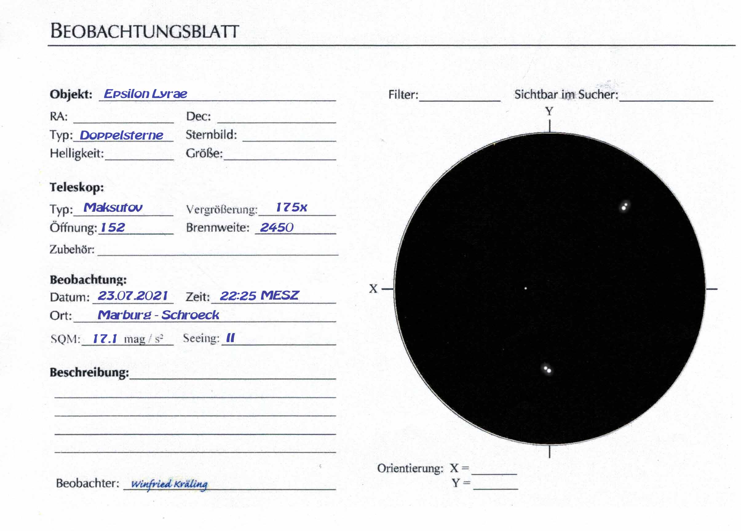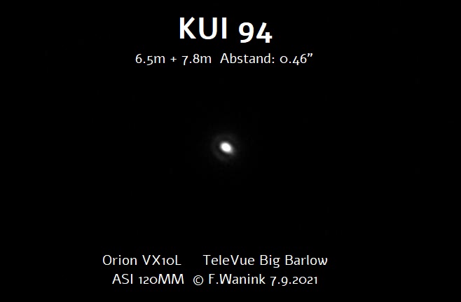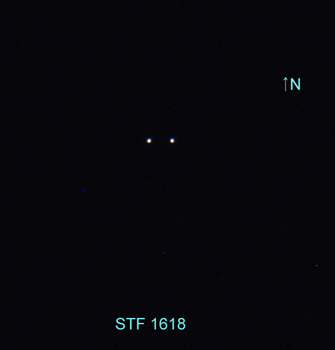 AB: 14.09.2021: Einfach trennbar bei moderatem Abstand und deutlichem Helligkeitsunterschied. Die Hauptkomponente wirkte gelblich, der schwache Begleiter war nur indirekt sichtbar. |
