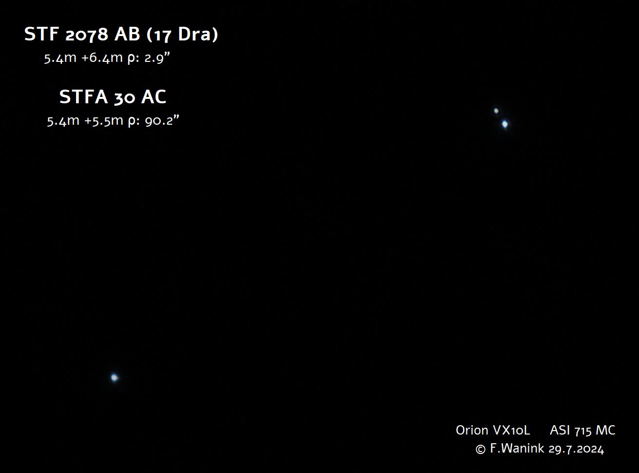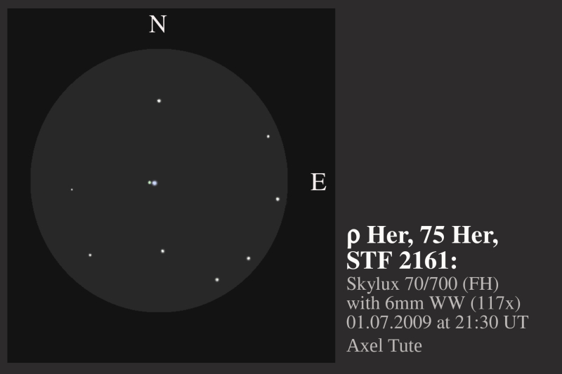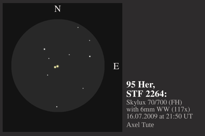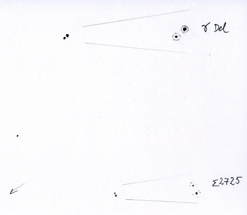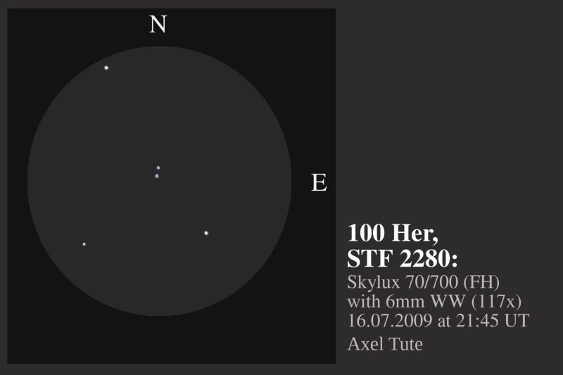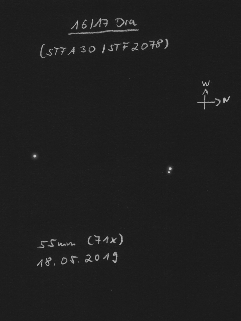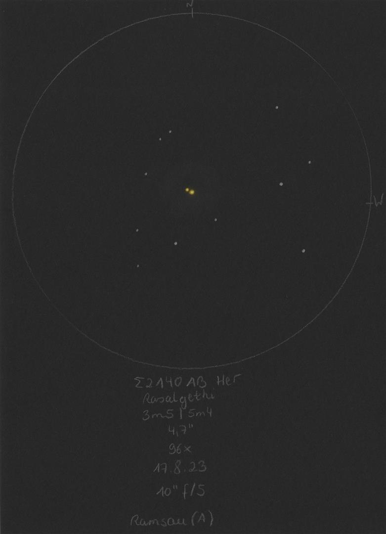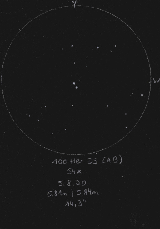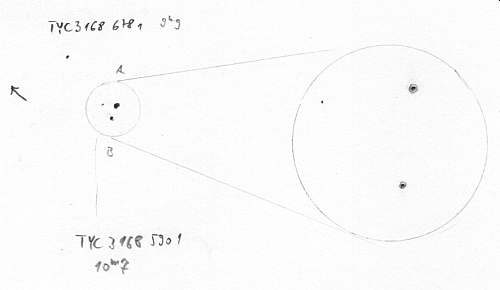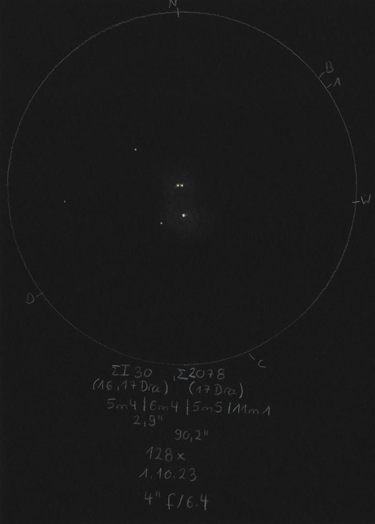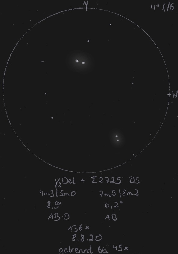 AB: bei 32x zeigt sich B ganz knapp getrennt nordwestlich von A - Helligkeitsunterschied gut 2 Größenklassen - der Doppelstern bildet mit drei helleren Sternen eine flache Drachenraute |