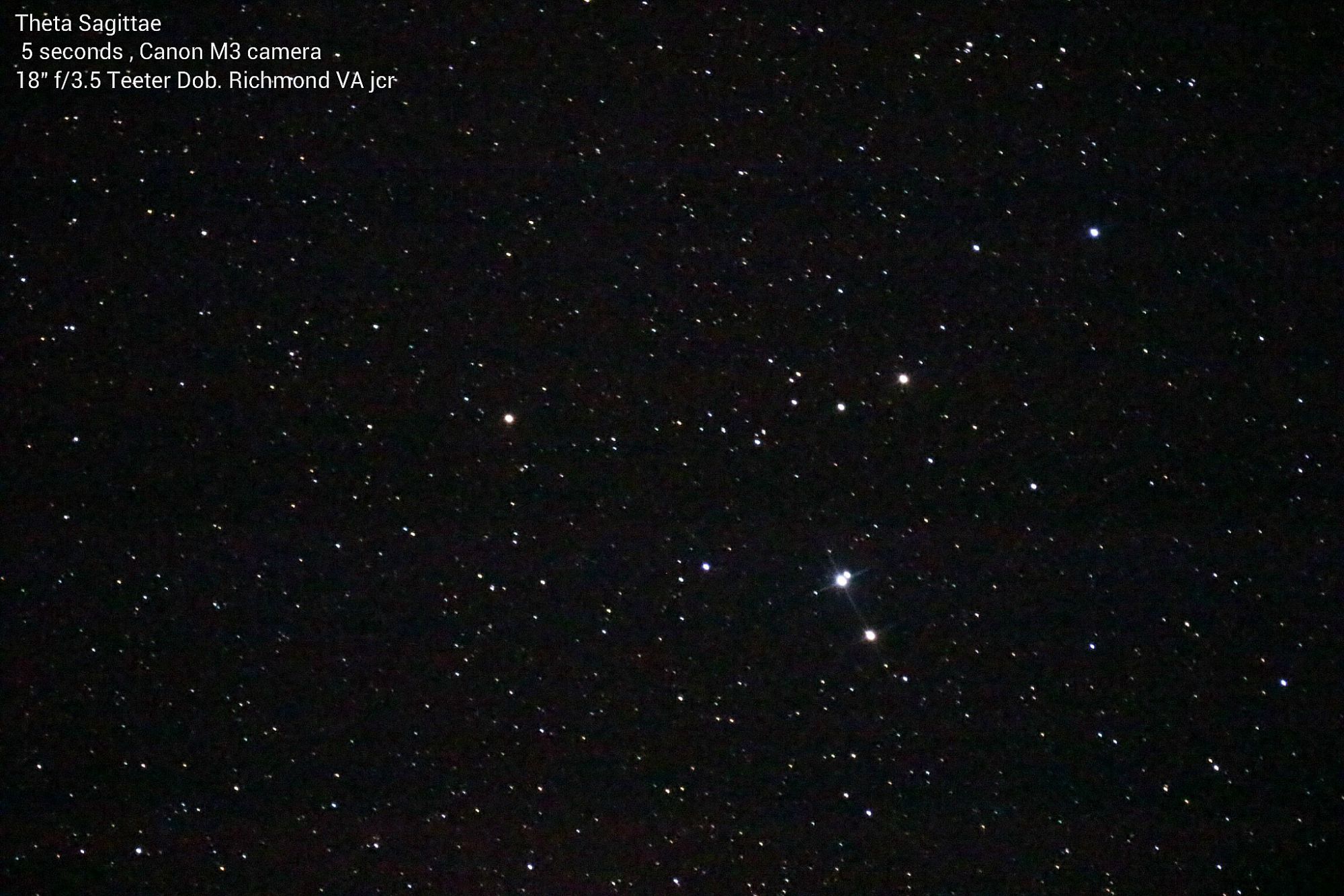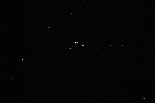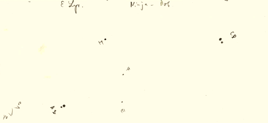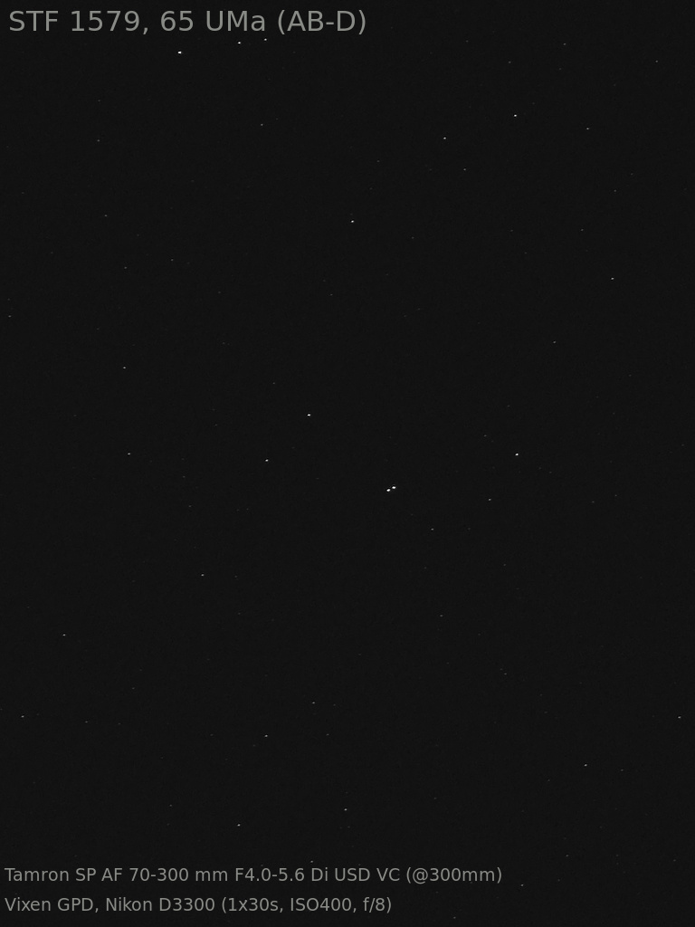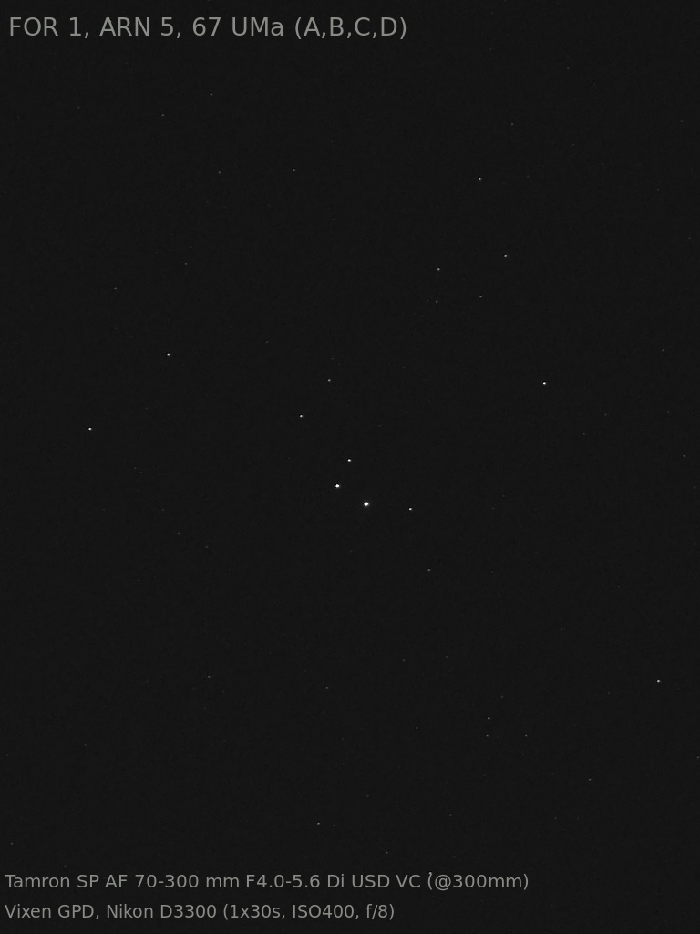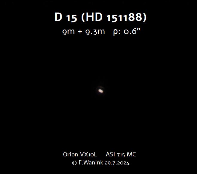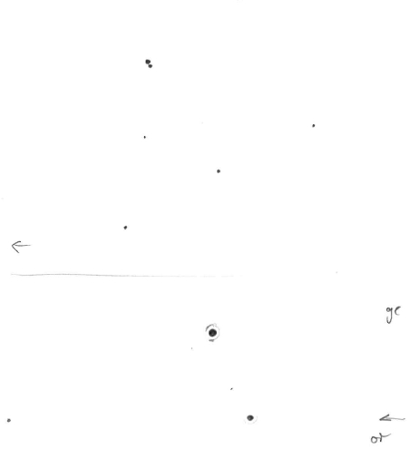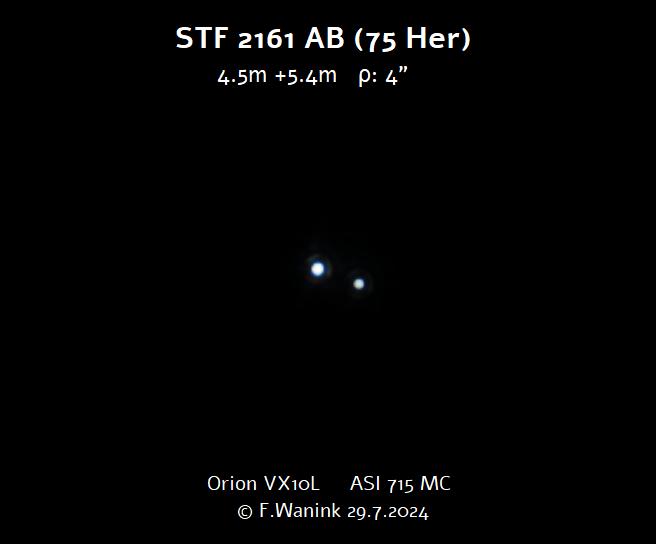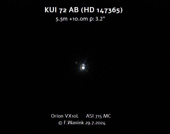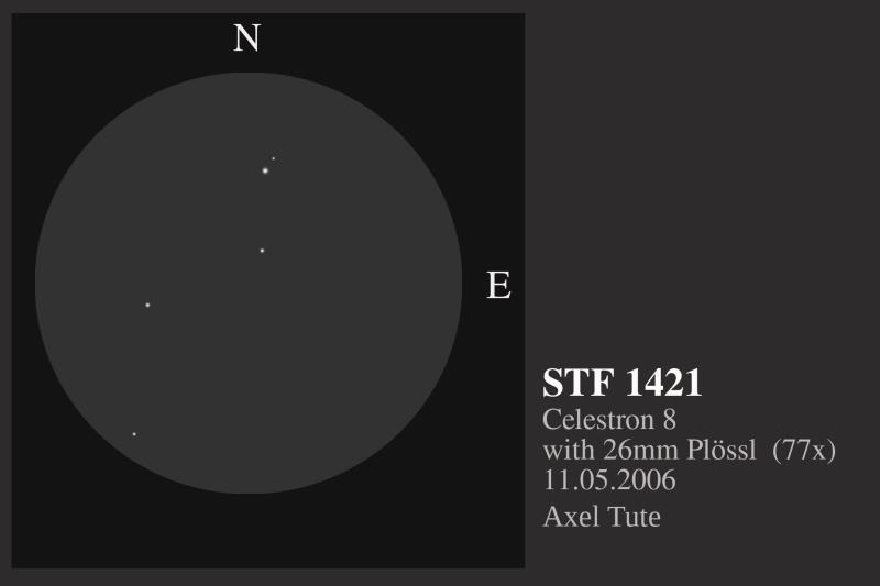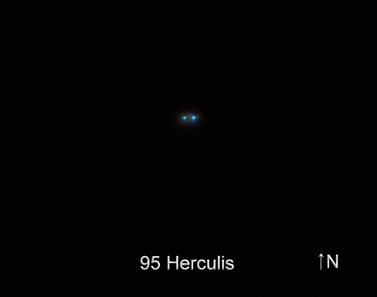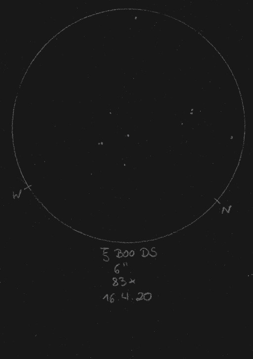 AB: bei 32x zeigt sich B ganz knapp getrennt nordwestlich von A - Helligkeitsunterschied gut 2 Größenklassen - der Doppelstern bildet mit drei helleren Sternen eine flache Drachenraute |