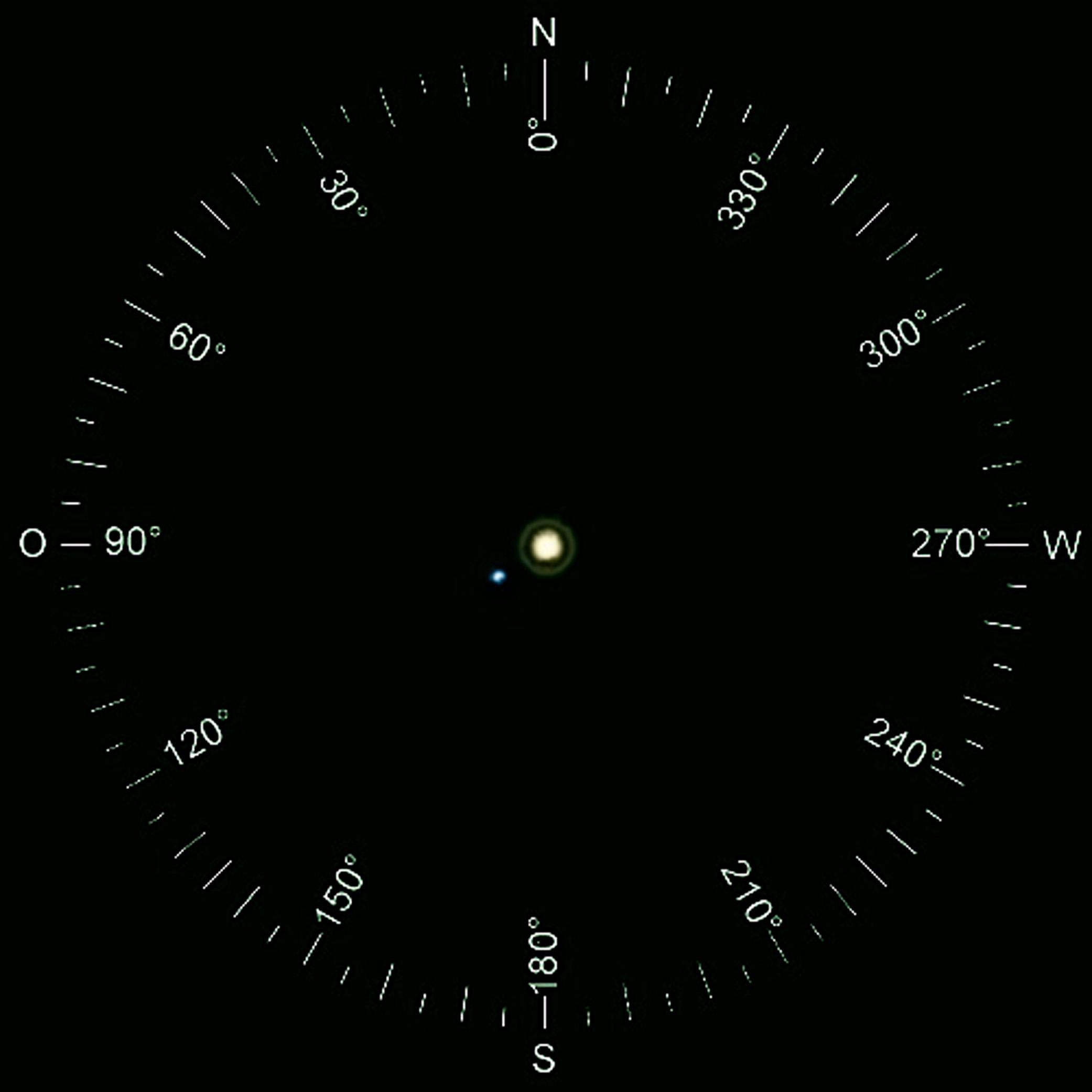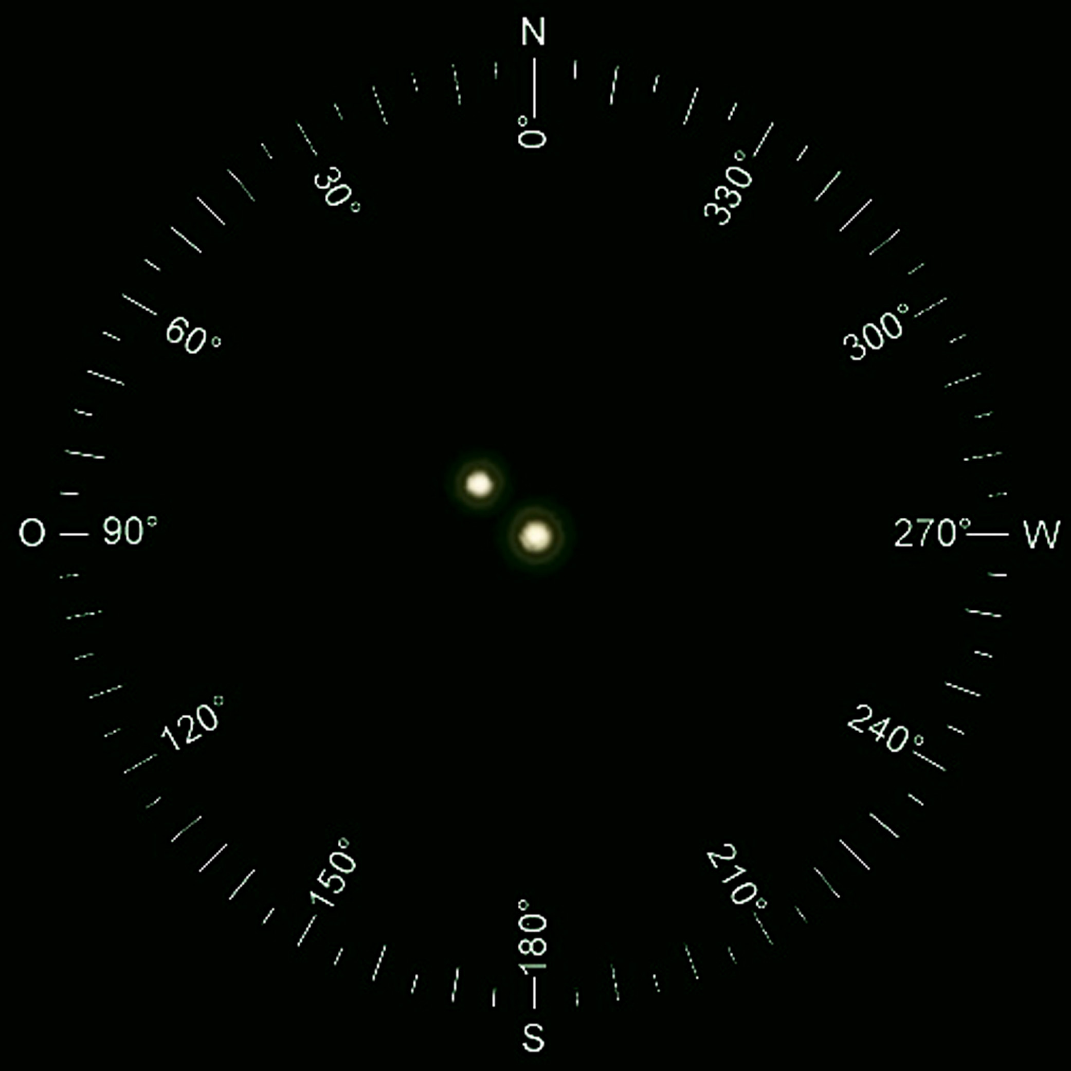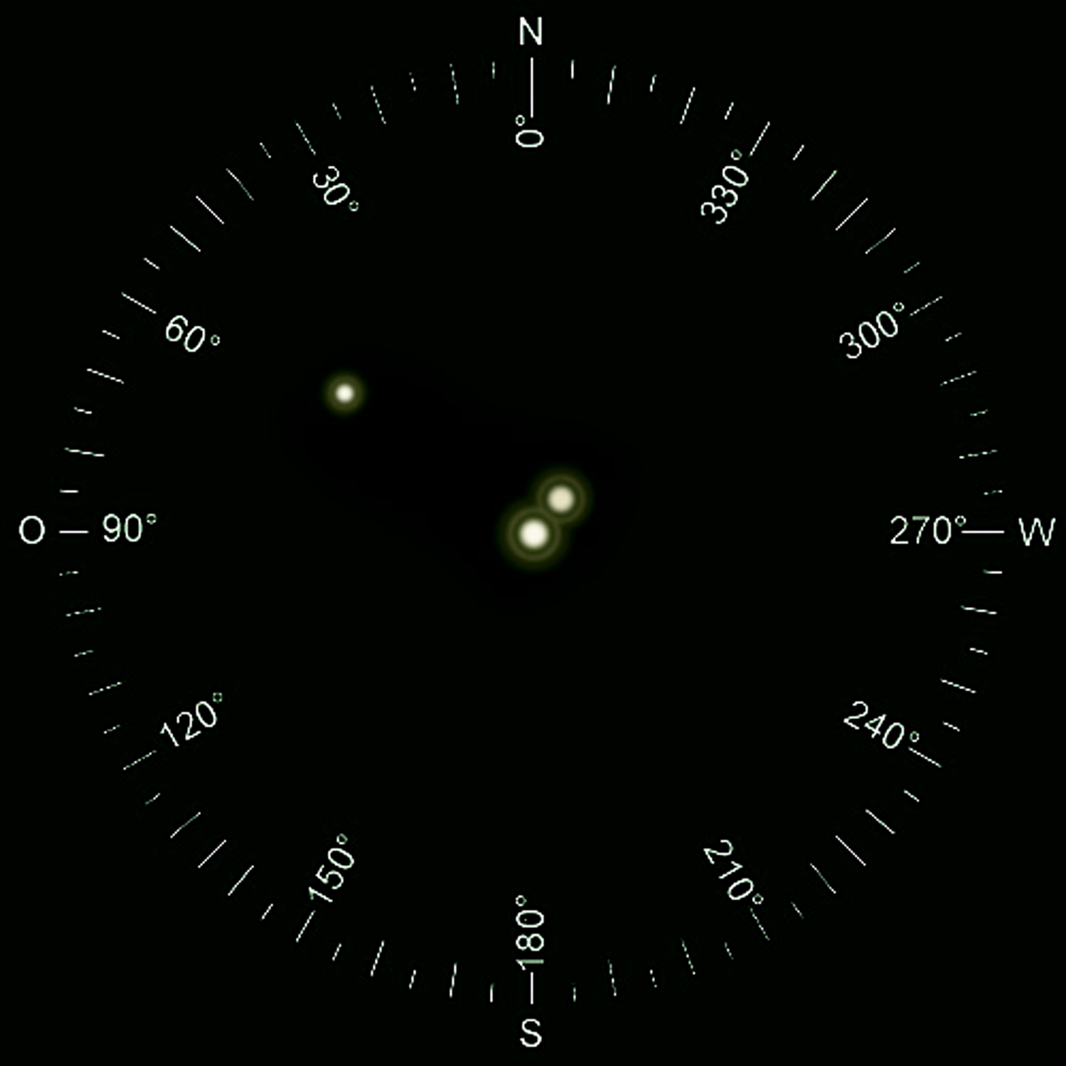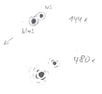 bei 45x zeigt sich B bereits weit abgesetzt im Westen von A - Komponente A ist weißgelblich, B dagegen ist 1.5 bis 2 Größenklassen schwächer und strahlt braun-grau |