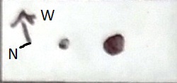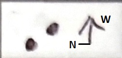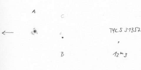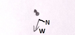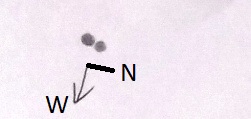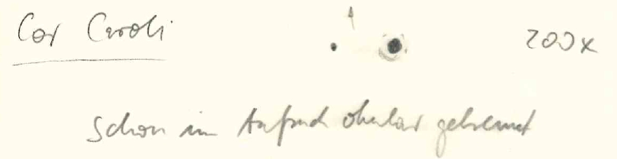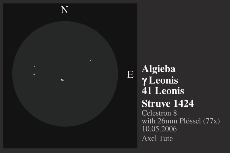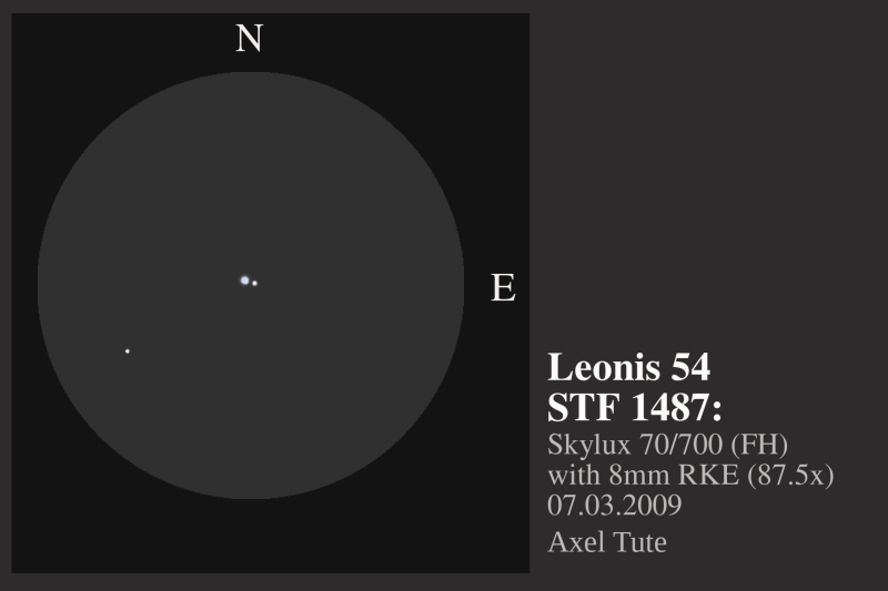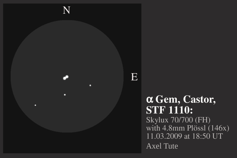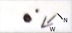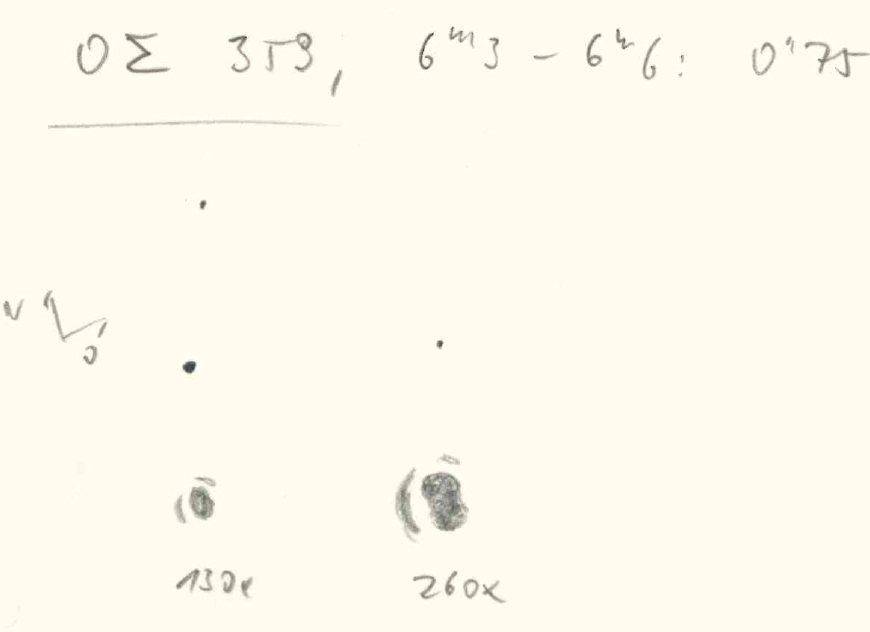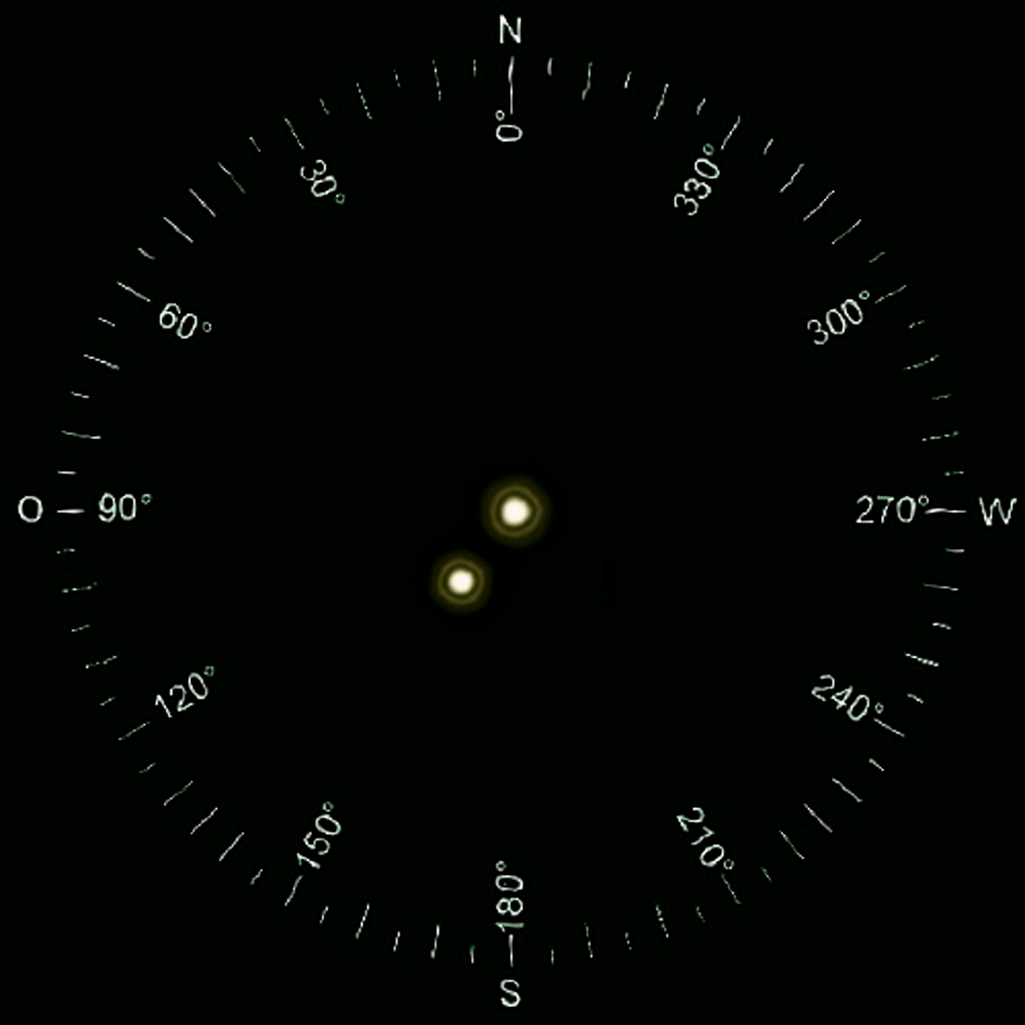 bei 45x zeigt sich B bereits weit abgesetzt im Westen von A - Komponente A ist weißgelblich, B dagegen ist 1.5 bis 2 Größenklassen schwächer und strahlt braun-grau |