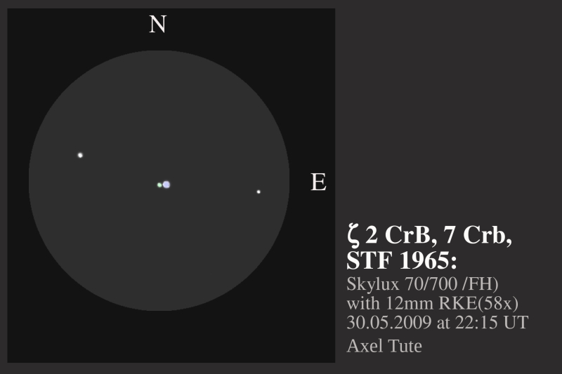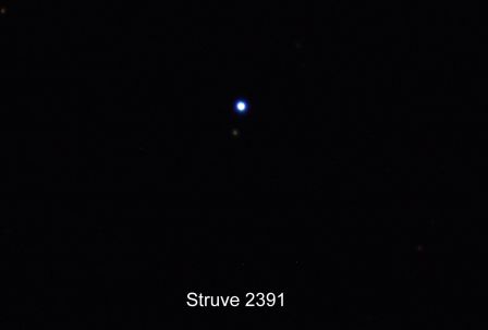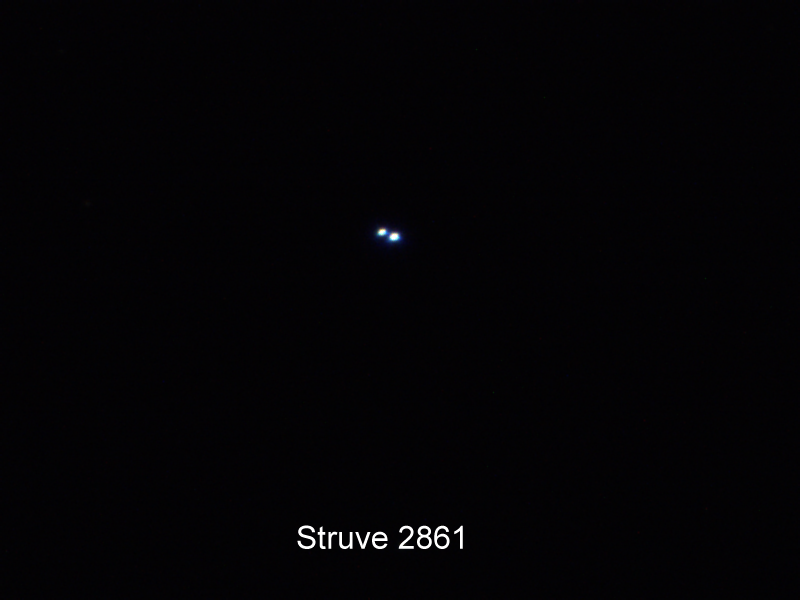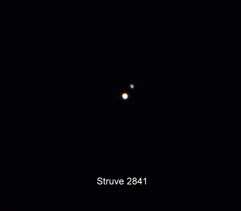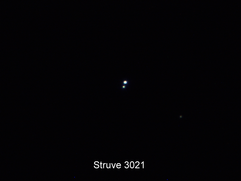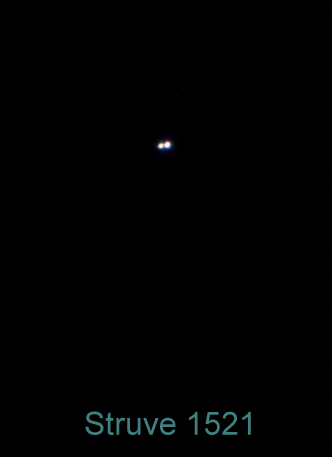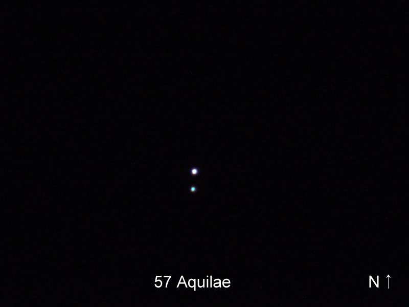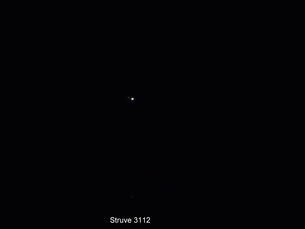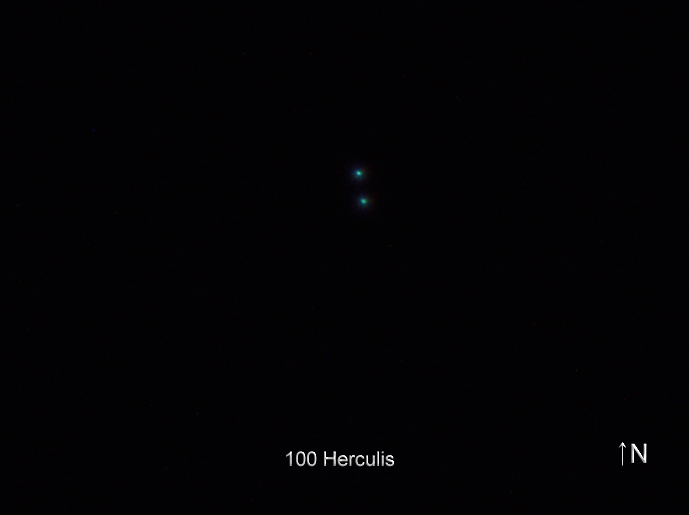 Gut trennbar bei 22x, aber relativ dicht zusammen bei recht deutlichem Helligkeitsunterschied. Bei 57x wirkte die Hauptkomponente leicht gelblich, der Begleiter eher grau-bläulich. |