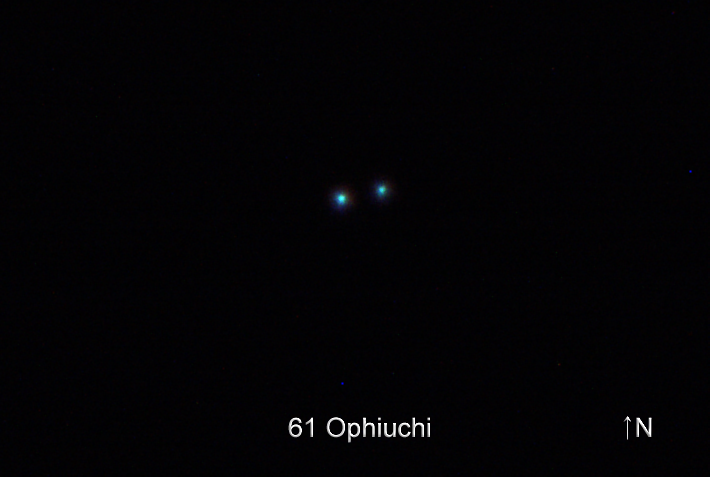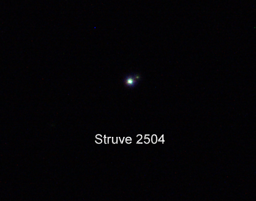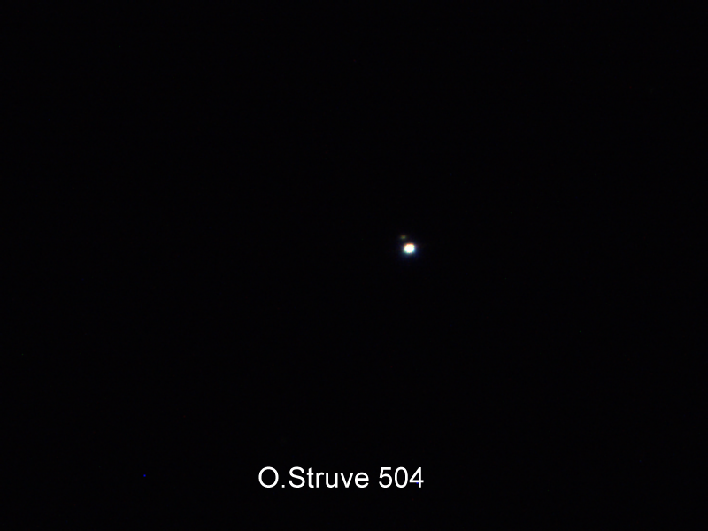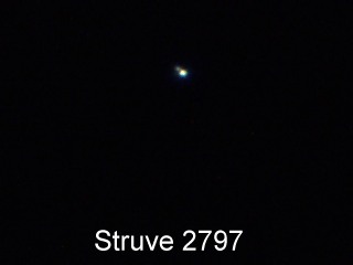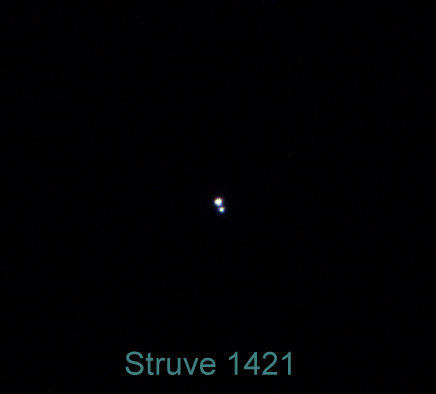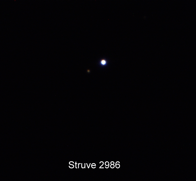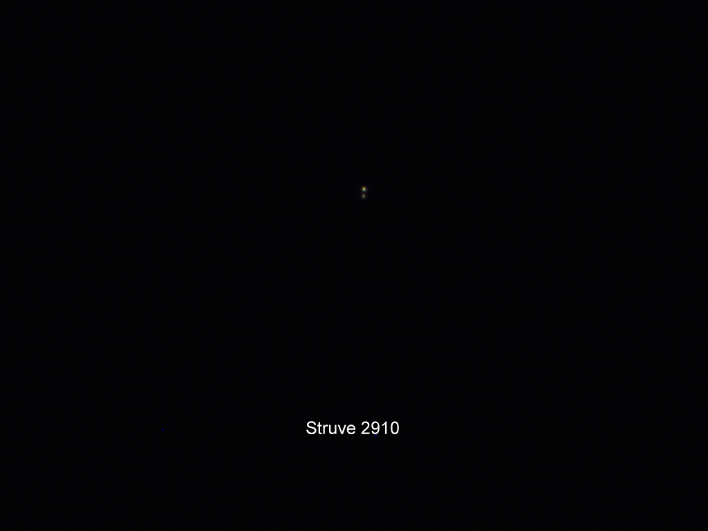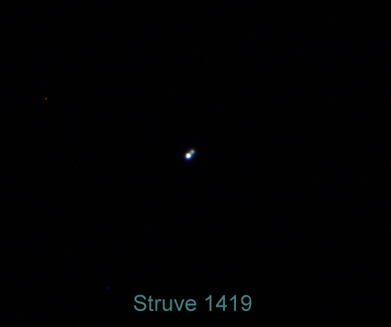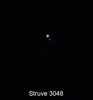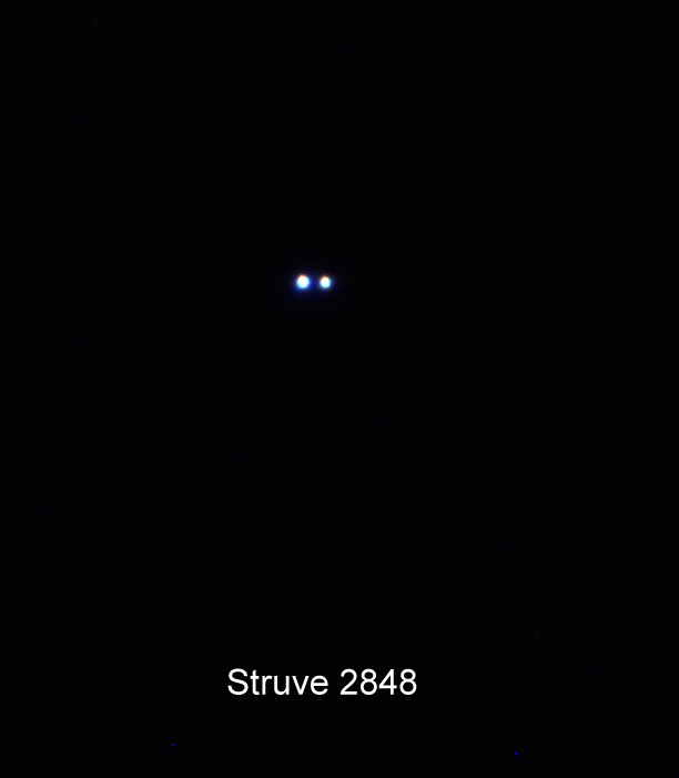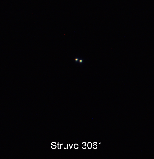 Gut trennbar bei 22x, aber relativ dicht zusammen bei recht deutlichem Helligkeitsunterschied. Bei 57x wirkte die Hauptkomponente leicht gelblich, der Begleiter eher grau-bläulich. |