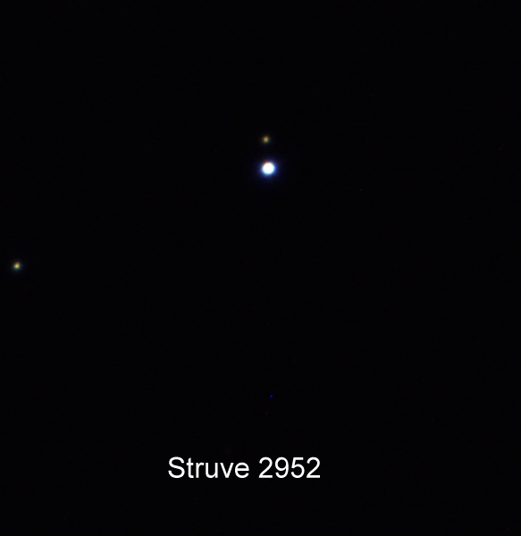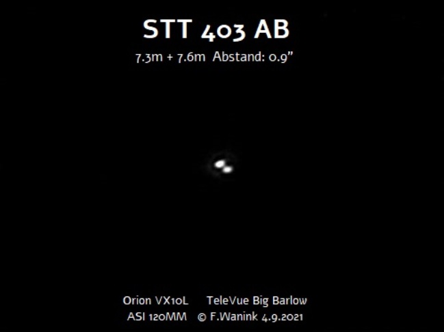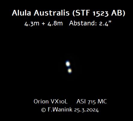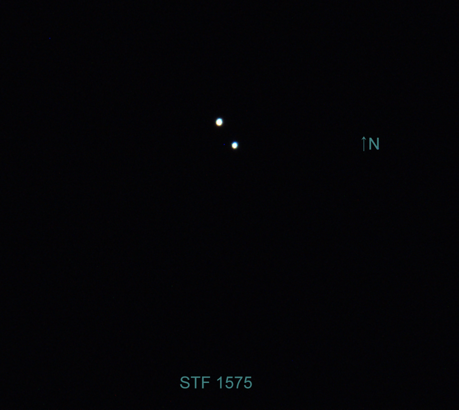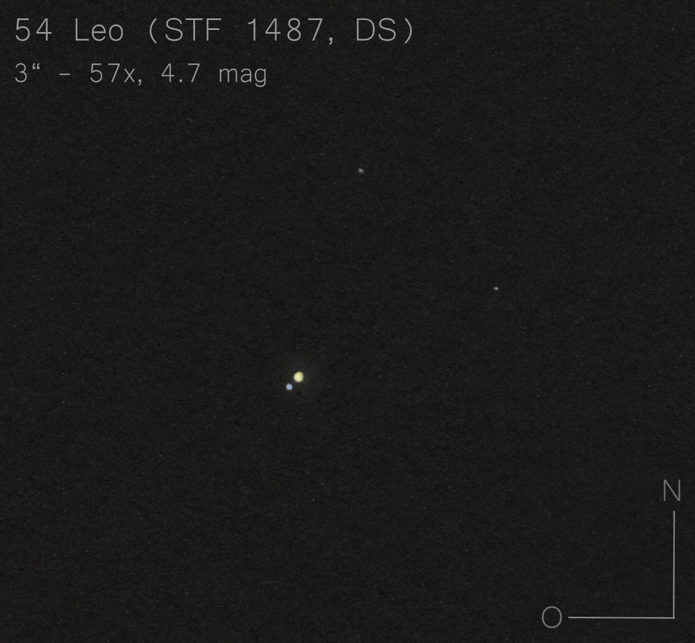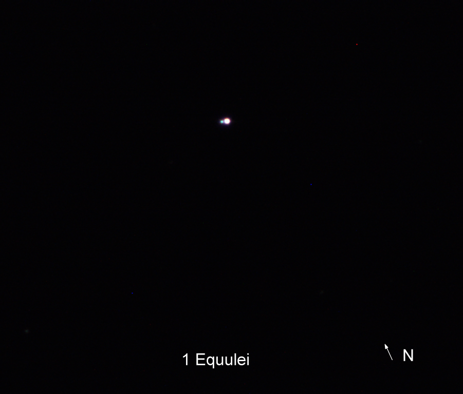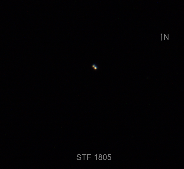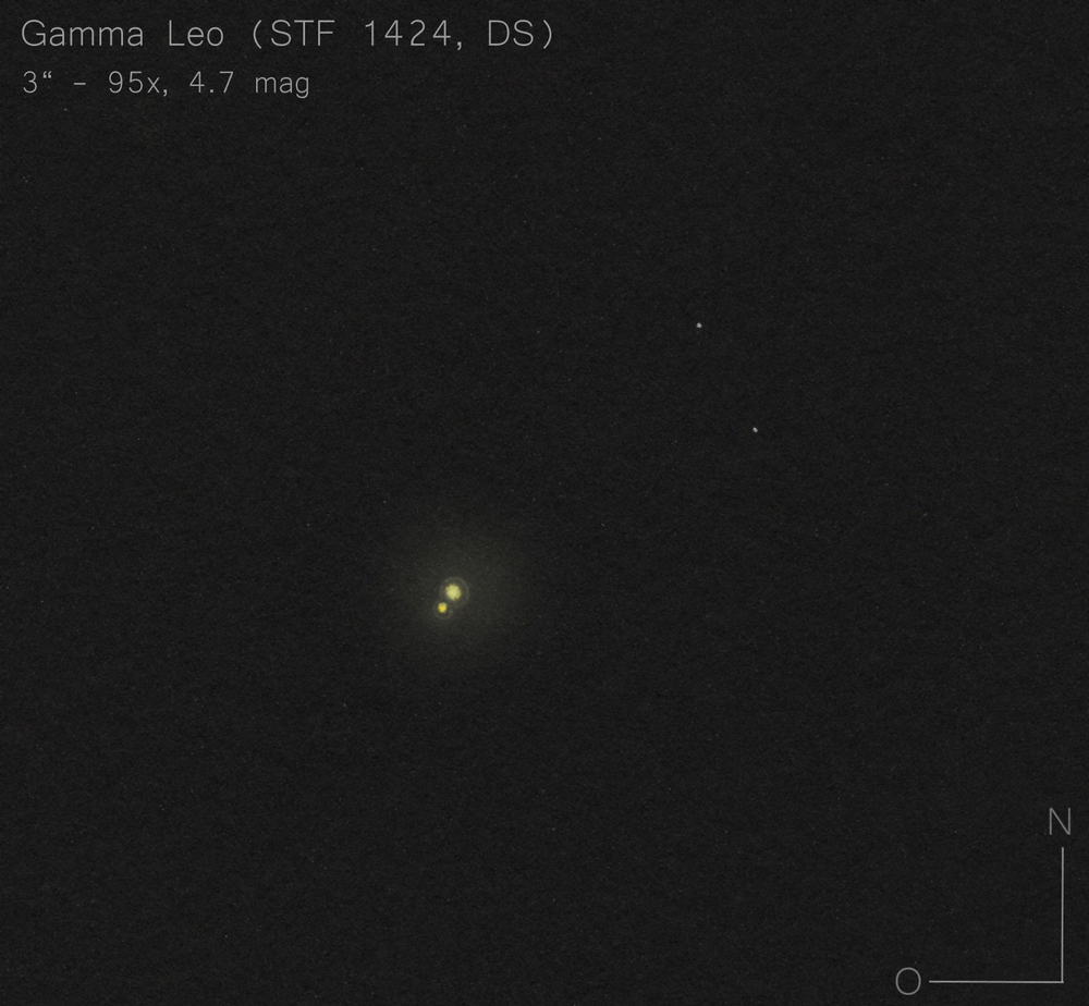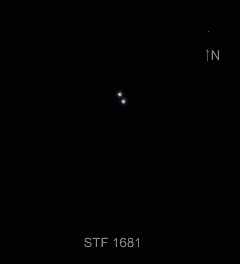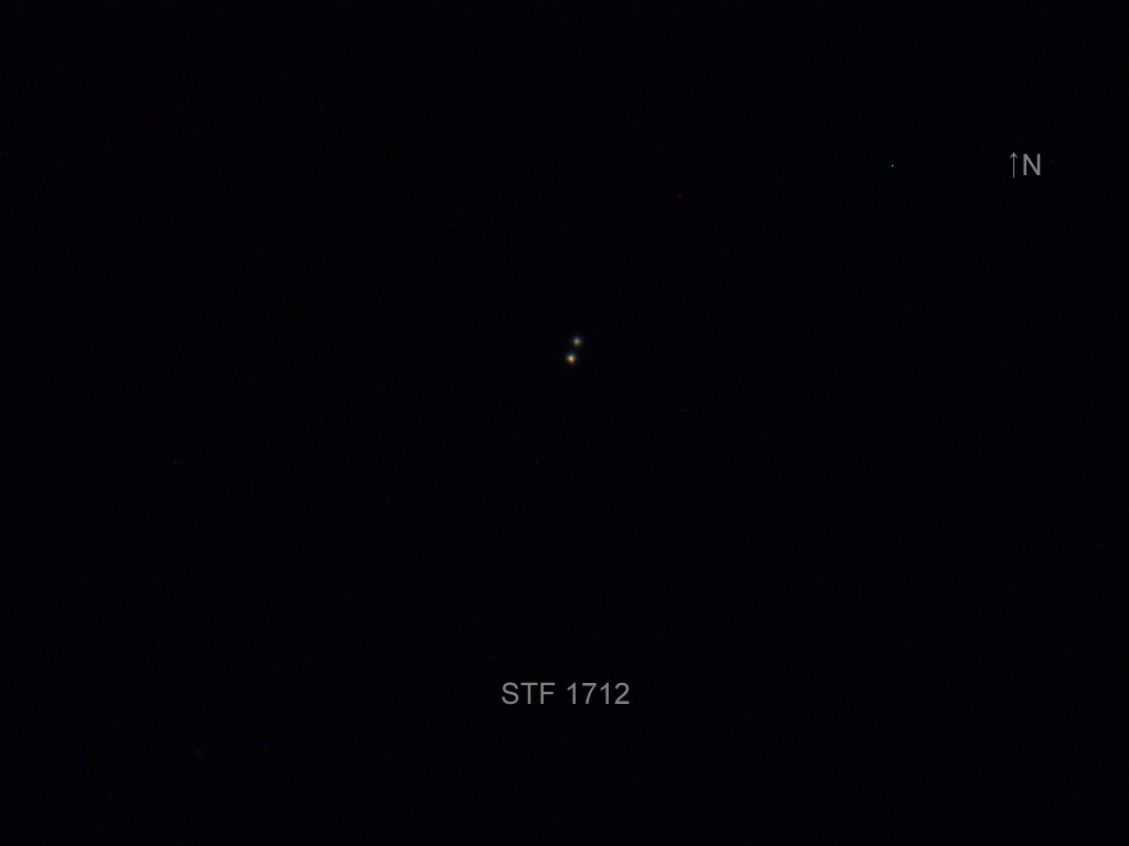 AB: einfach - beide Sterne zeigen sich komfortabel getrennt - Komponente A strahlt gelblich - Komponente B südöstlich wirkt dagegen grau und ist 1.5 bis 2 Größenklassen schwächer |