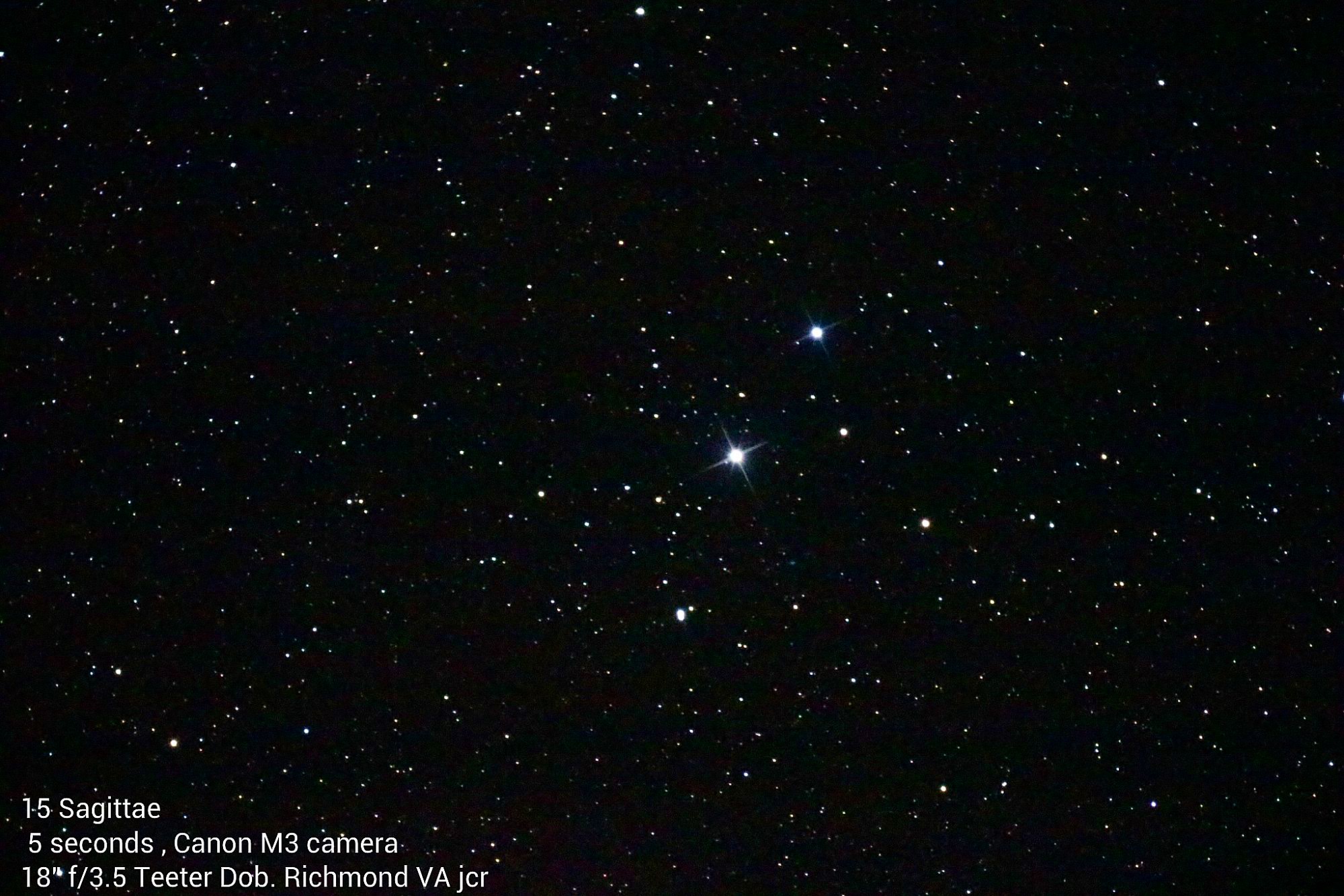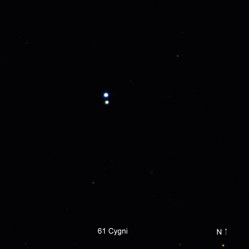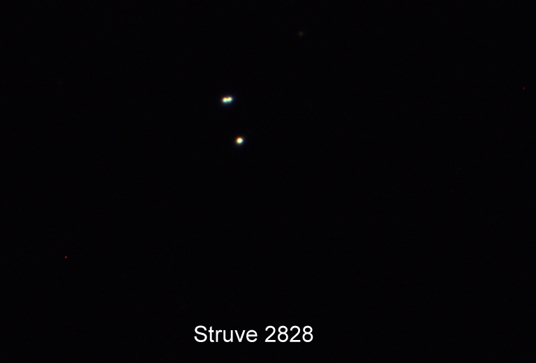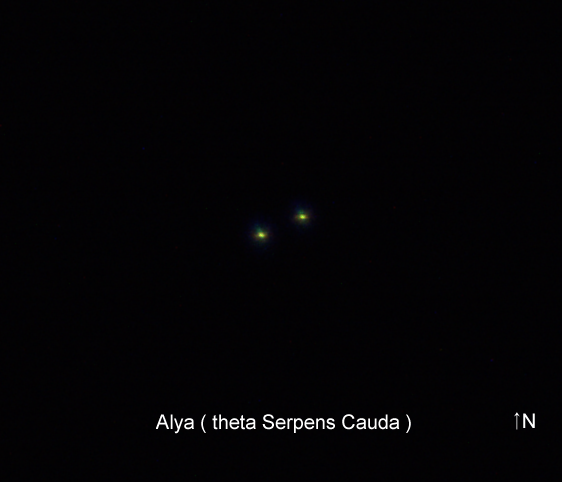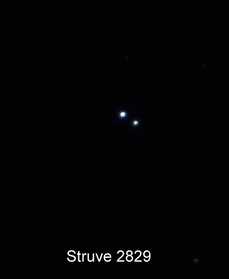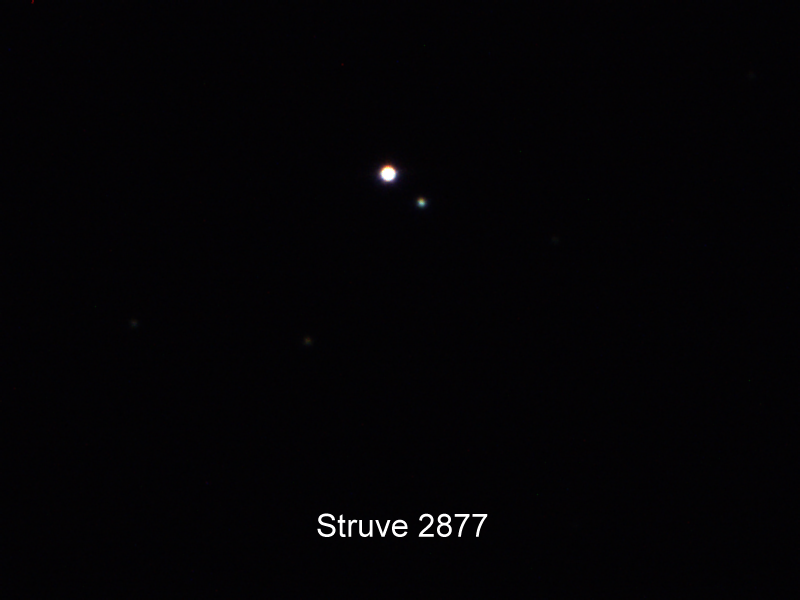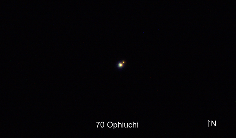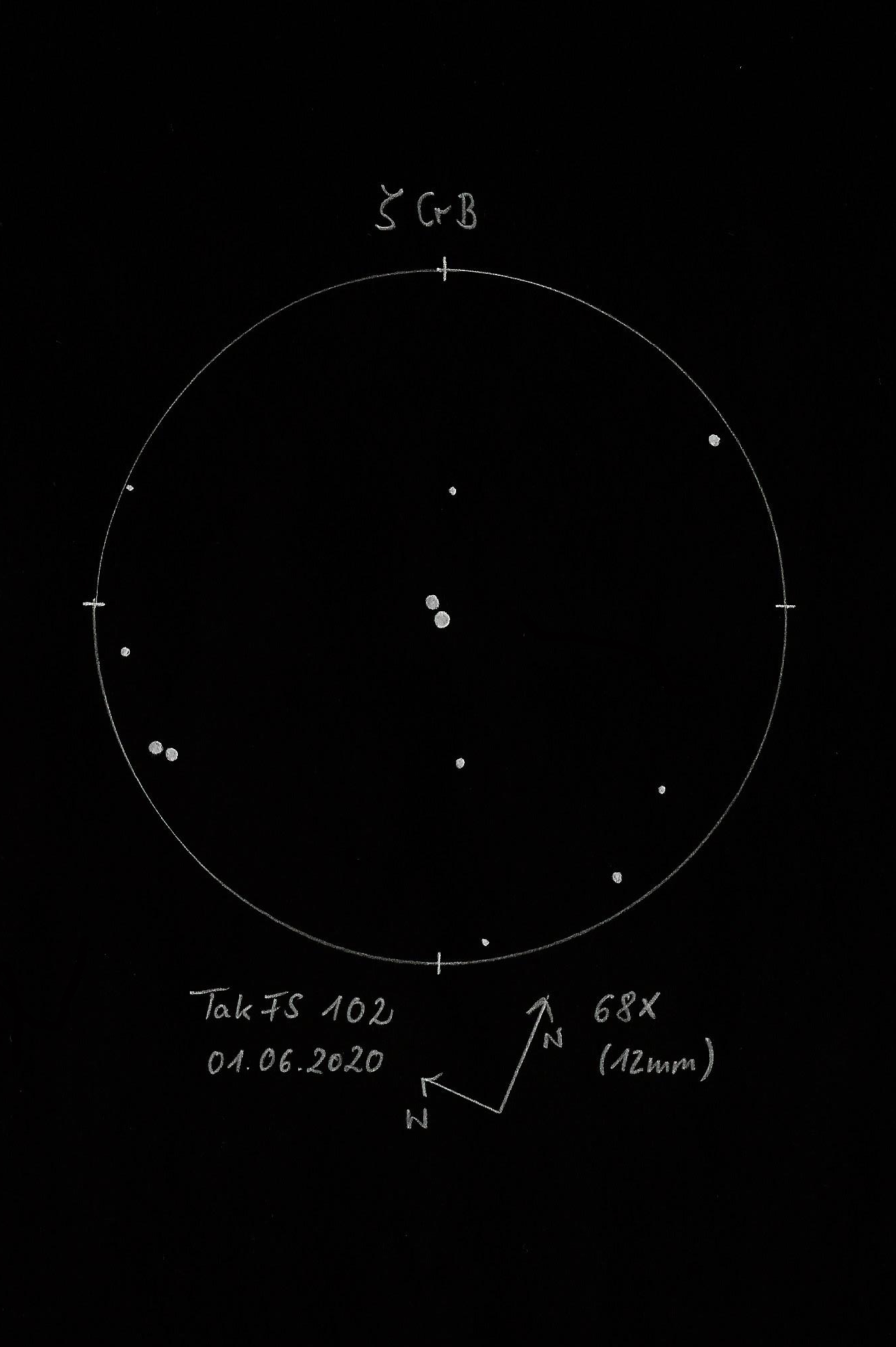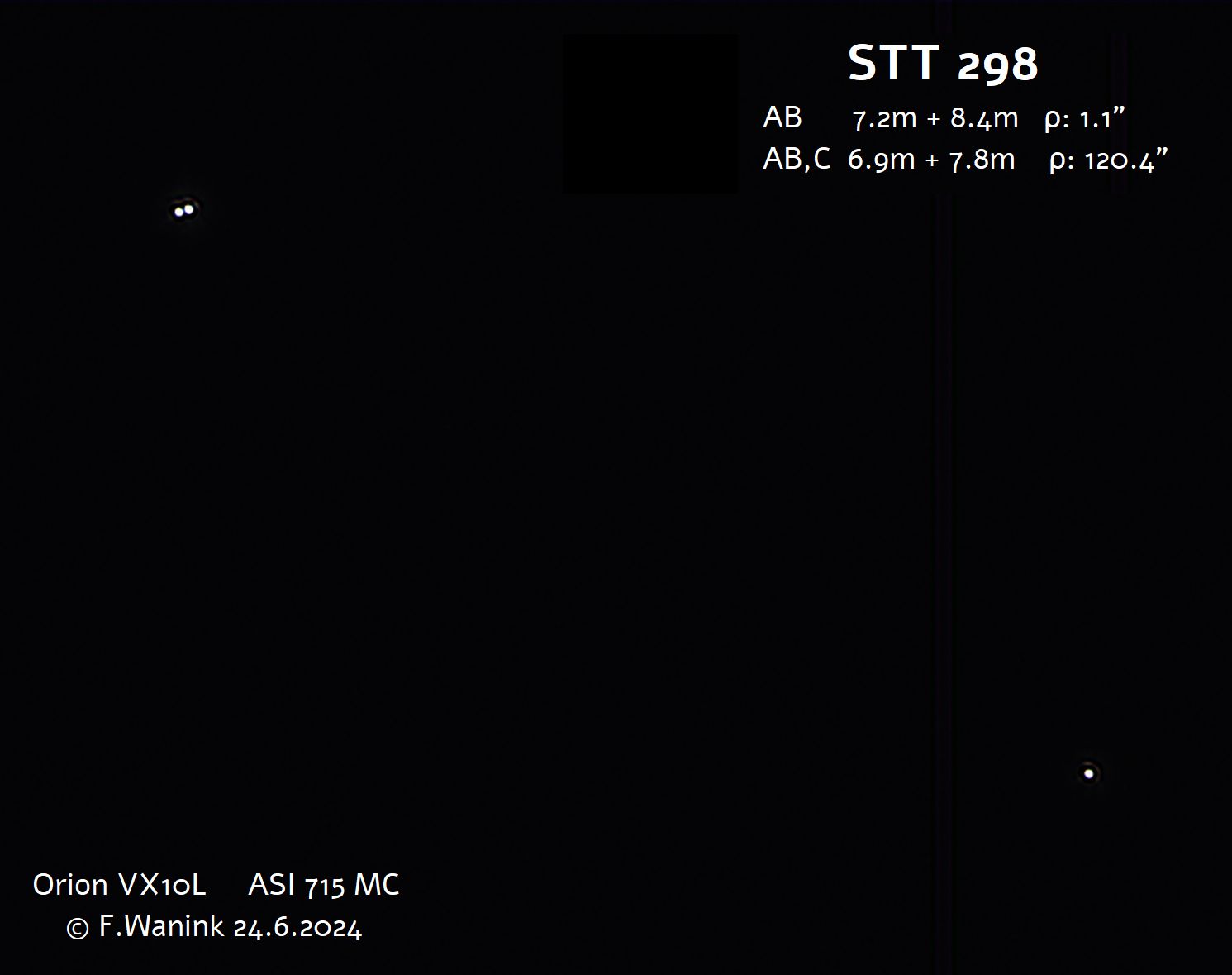 AB: einfach - beide Sterne zeigen sich komfortabel getrennt - Komponente A strahlt gelblich - Komponente B südöstlich wirkt dagegen grau und ist 1.5 bis 2 Größenklassen schwächer |