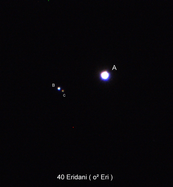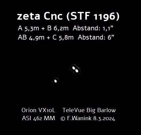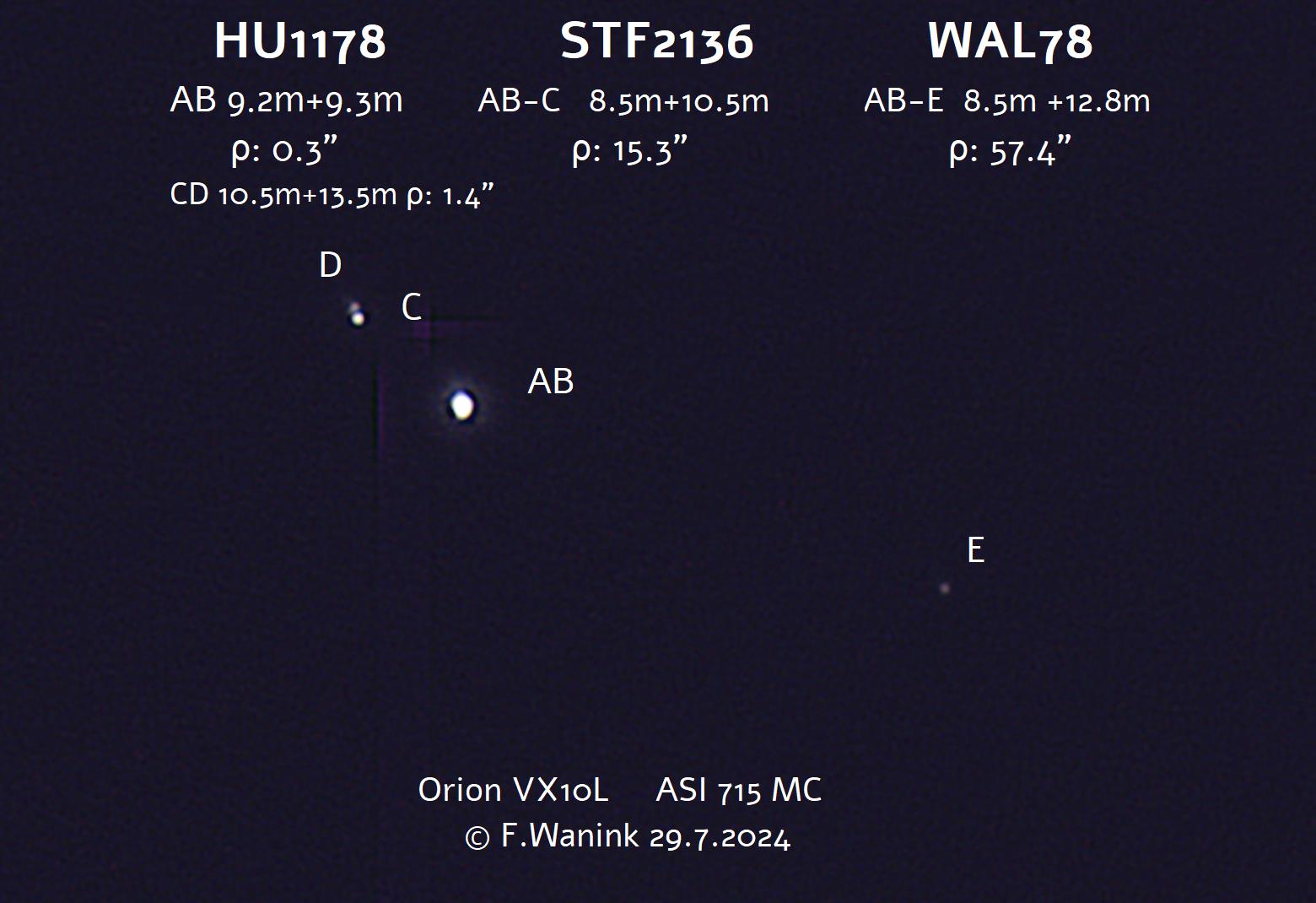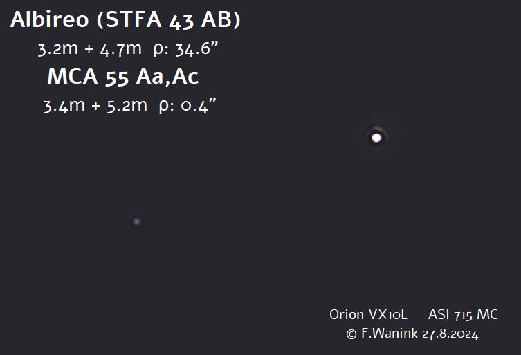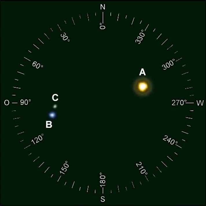 AC: Bei 27x einfach zu trennen bei eher großem Abstand und deutlichem Helligkeitsunterschied. Bei 38x sind die Farben etwas besser sichtbar: A strahlt in hellem orange, C erscheint eher grau-bläulich. |