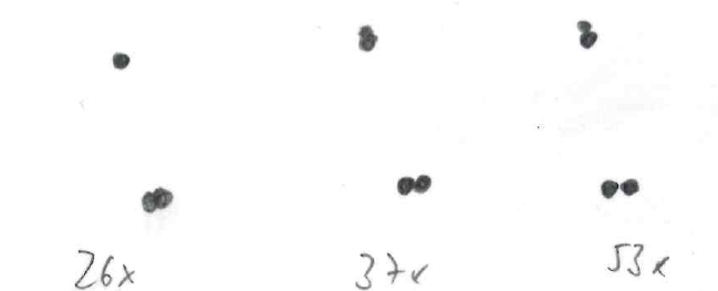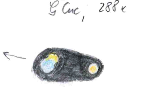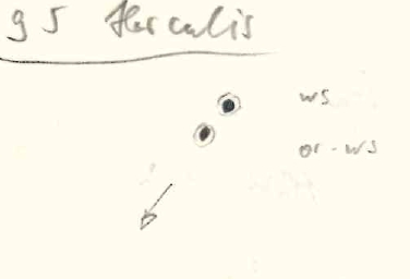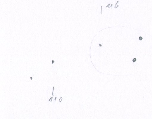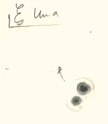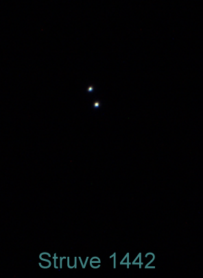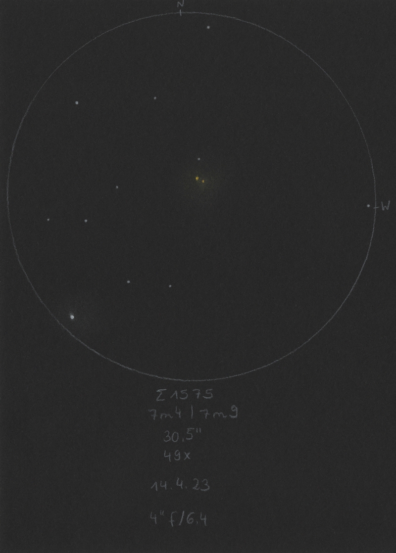 Bei 22x kleines Sternpärchen mit ähnlich hellen, dicht zusammenstehenden Komponenten. Bei 44x einfach zu trennen. Ein geringer Farbunterschied war erkennbar: Die hellere Komponente wirkte etwas wärmer mit einem Hauch von Orange, die schwächere leicht bläulich. |