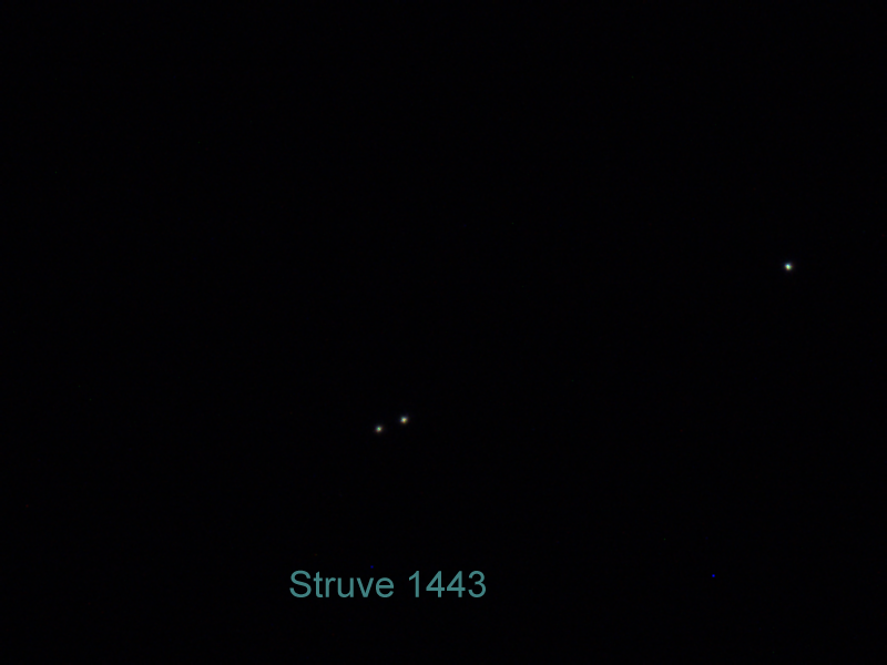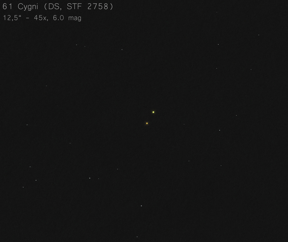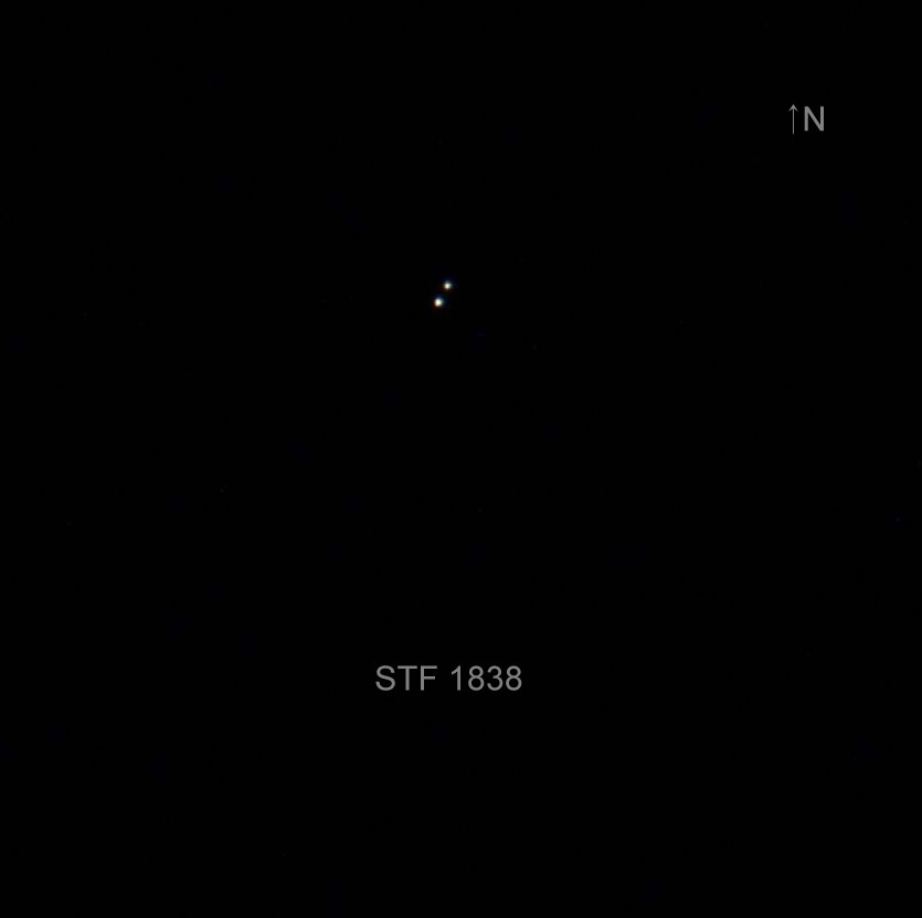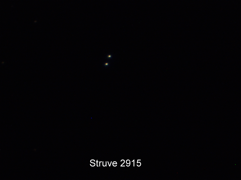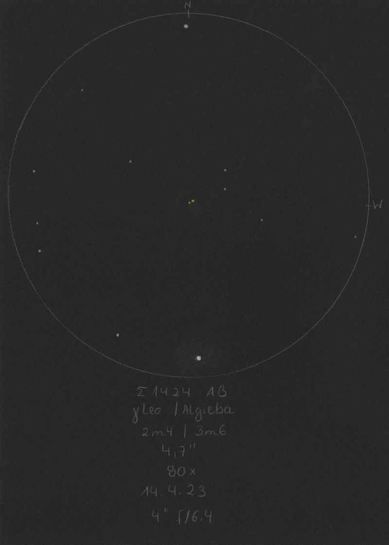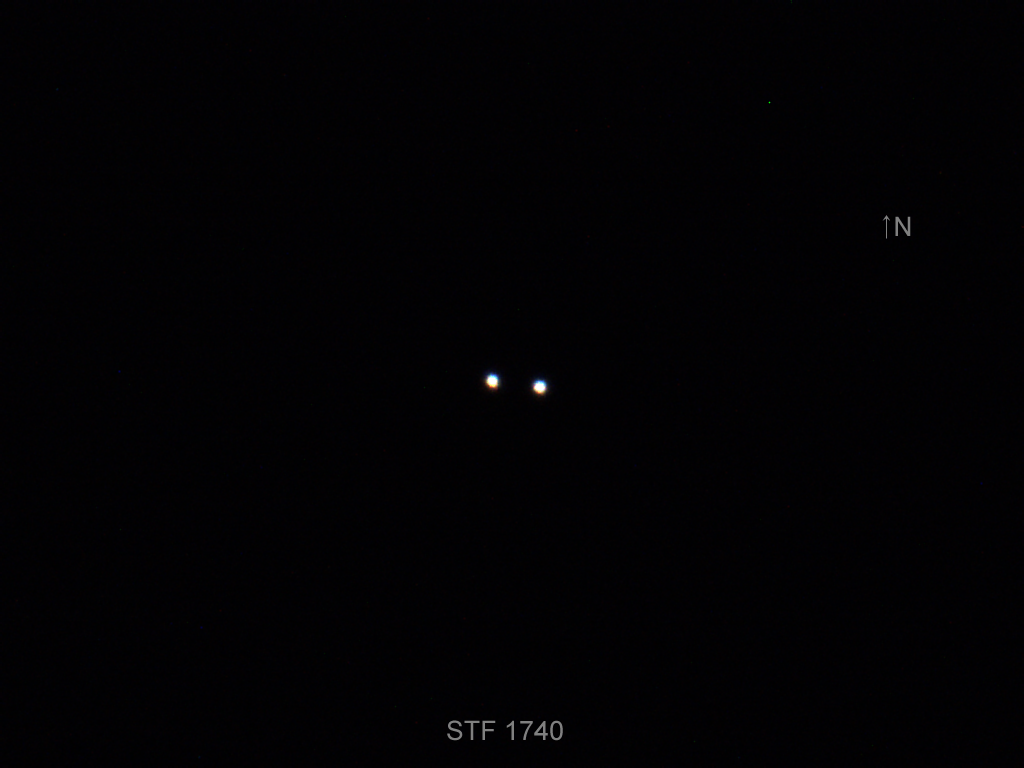 AB: bei 45x zeigt B sich gut abgesetzt nordwestlich von A - A wirkt Maisgelb, aber eher wie junger, frischer Mais, B ist 2 bis 3 Größenklassen schwächer und einen grauen Kittel an - bei 144x ist das Paar ansehnlicher, A ist sattgelb, B weißgrau |