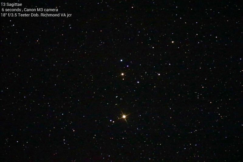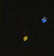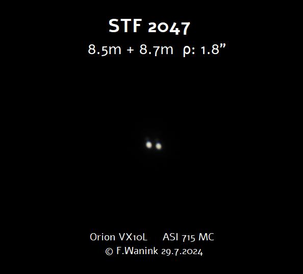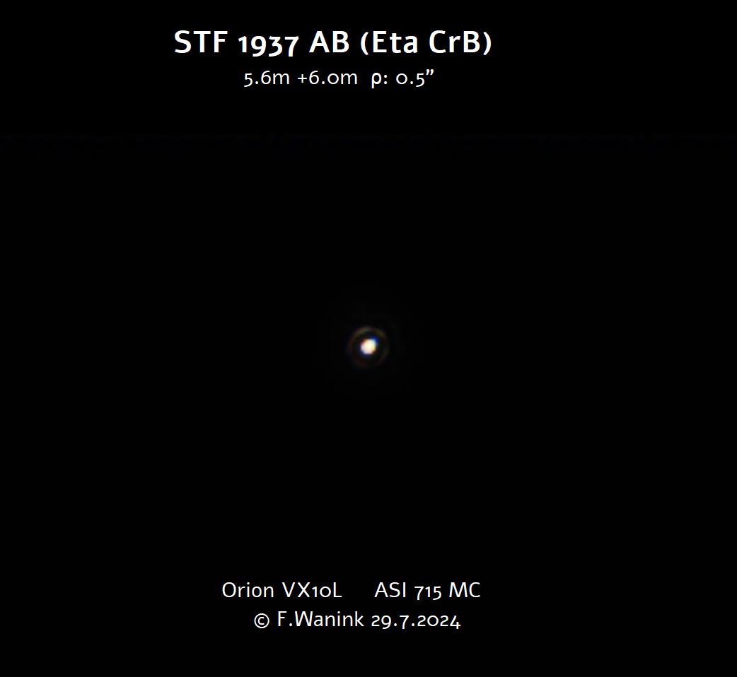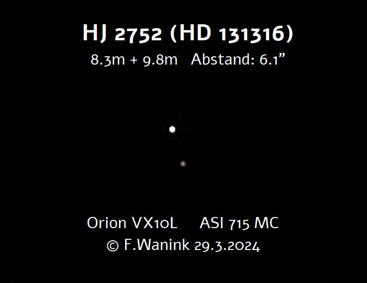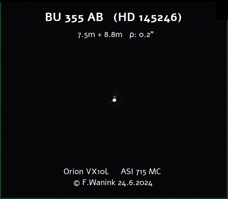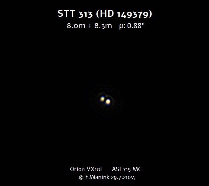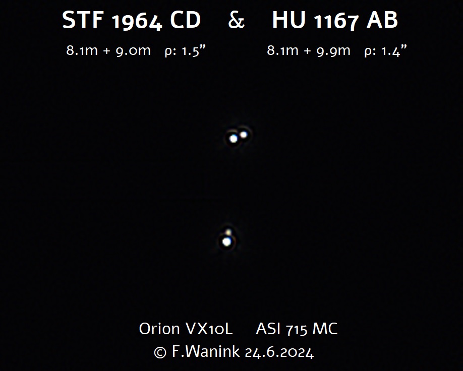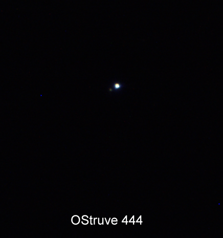 AB: bei 45x zeigt B sich gut abgesetzt nordwestlich von A - A wirkt Maisgelb, aber eher wie junger, frischer Mais, B ist 2 bis 3 Größenklassen schwächer und einen grauen Kittel an - bei 144x ist das Paar ansehnlicher, A ist sattgelb, B weißgrau |