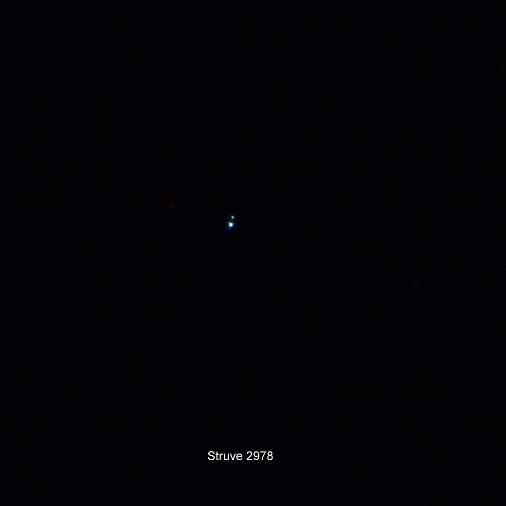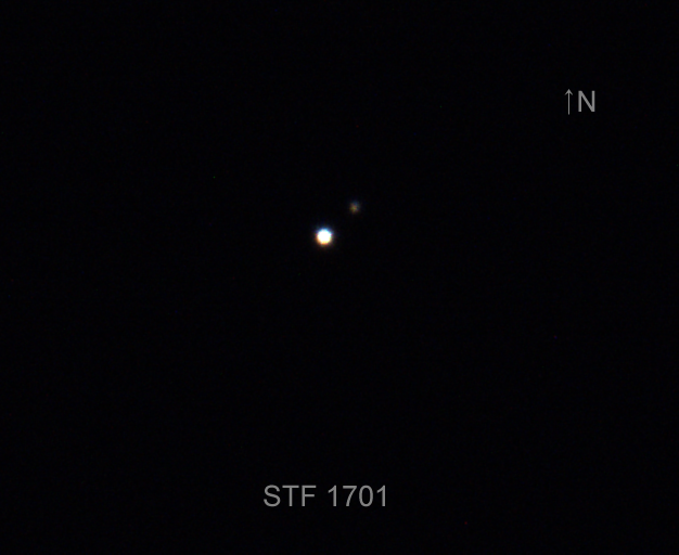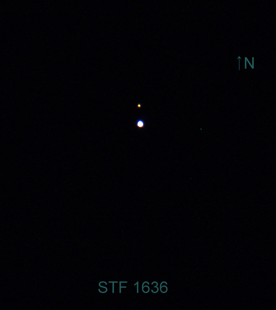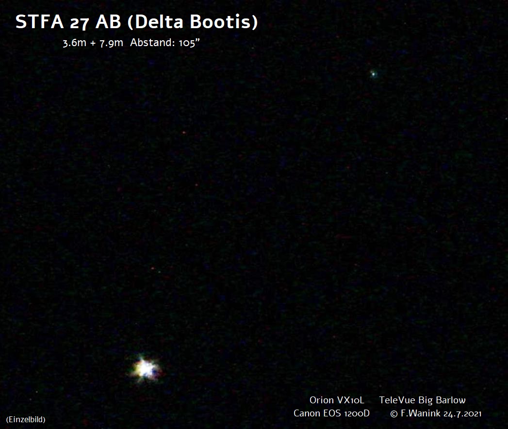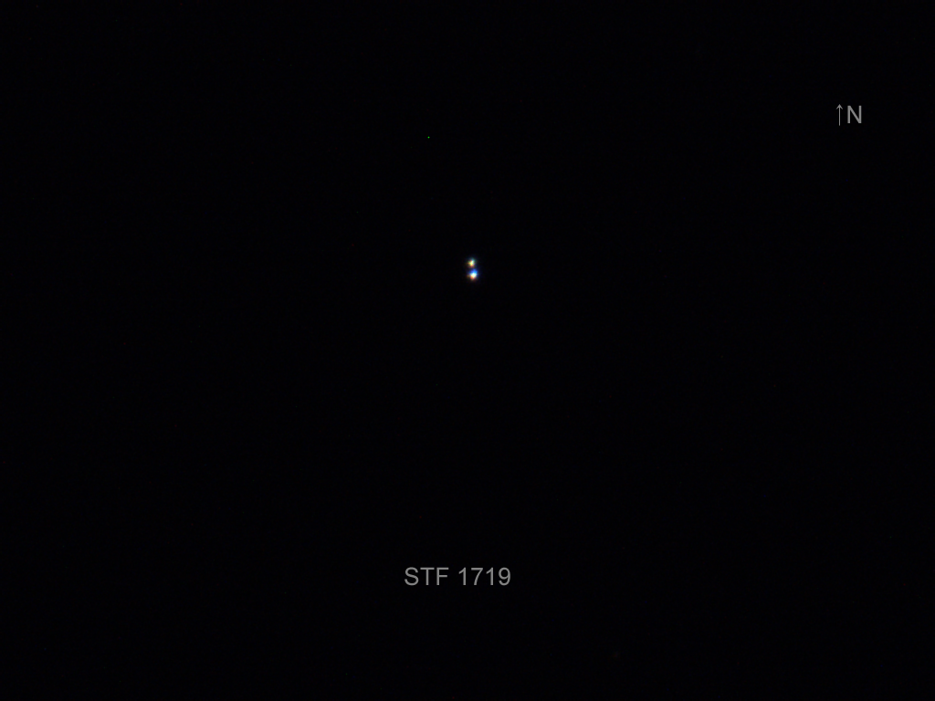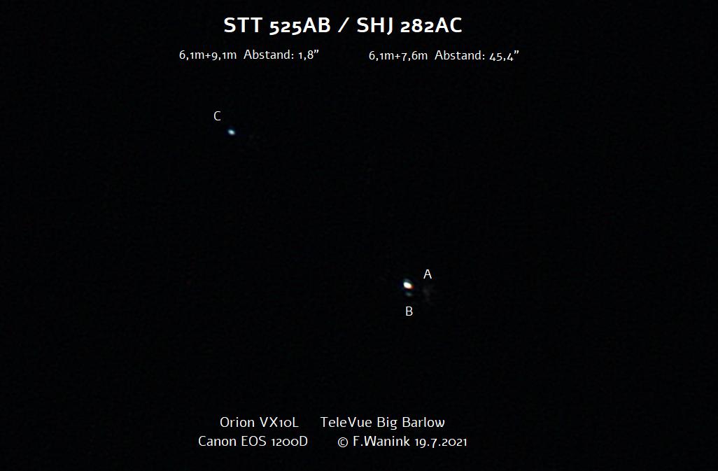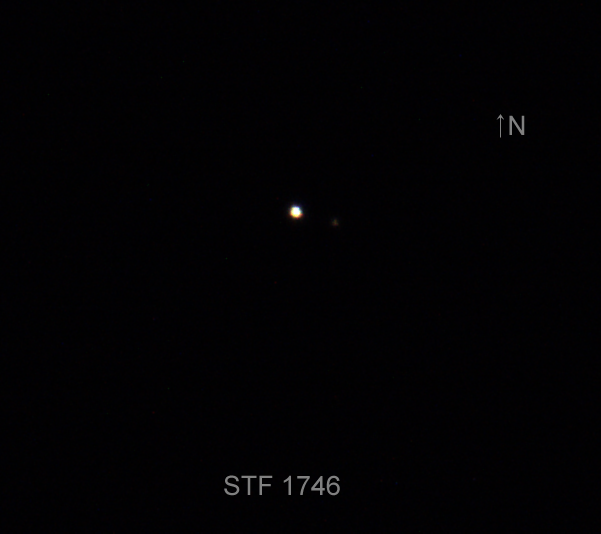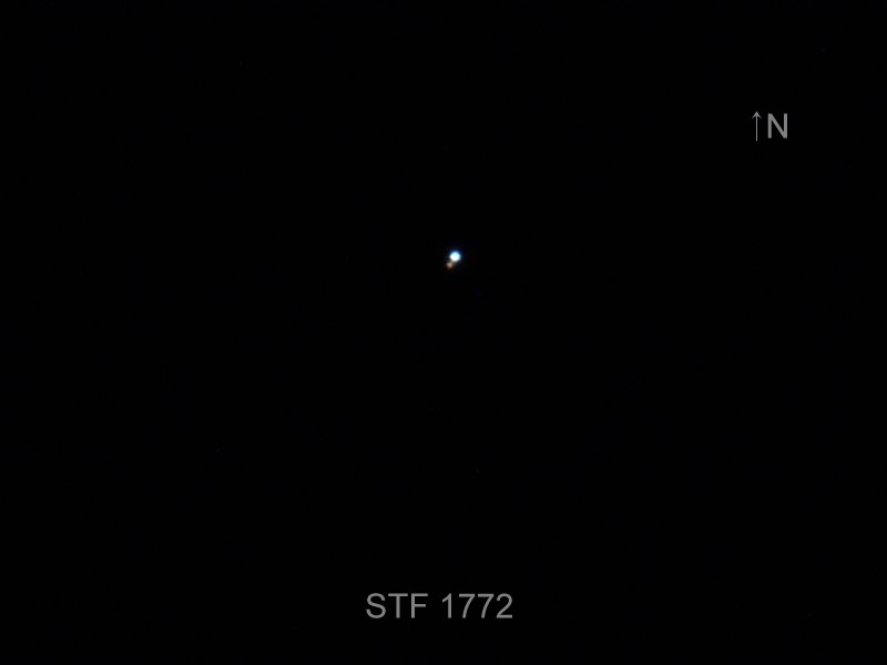 AB: 20x reicht zwar schon für eine klare Trennung, aber Komponente B im Osten ist nur dumpf grau-blau und noch zu schwach für den schönen Farbkontrast, der sich bei 32x offenbart - Komponente A strahlt dann in einem satten Bernsteingelb, B im Osten gibt sich unterkühlt bläulich - Helligkeitsunterschied 1 bis 1.5 Größenklassen, schwierig abschätzbar wegen der Farben |