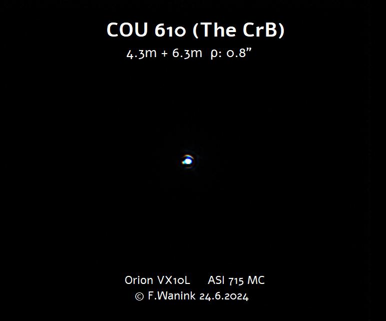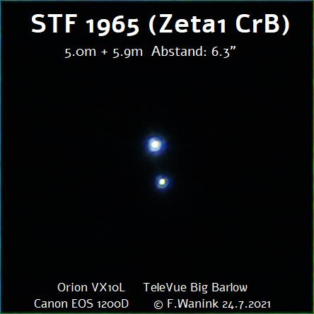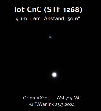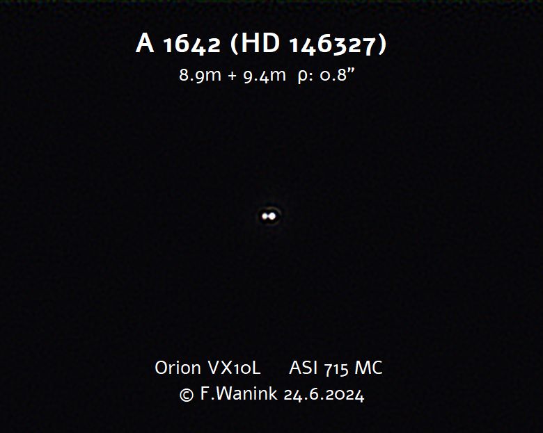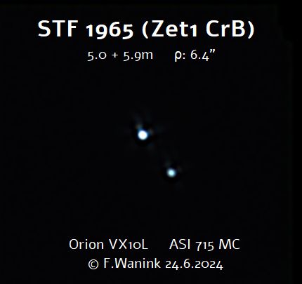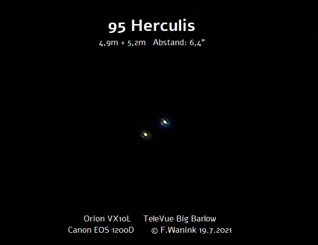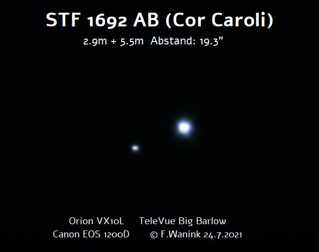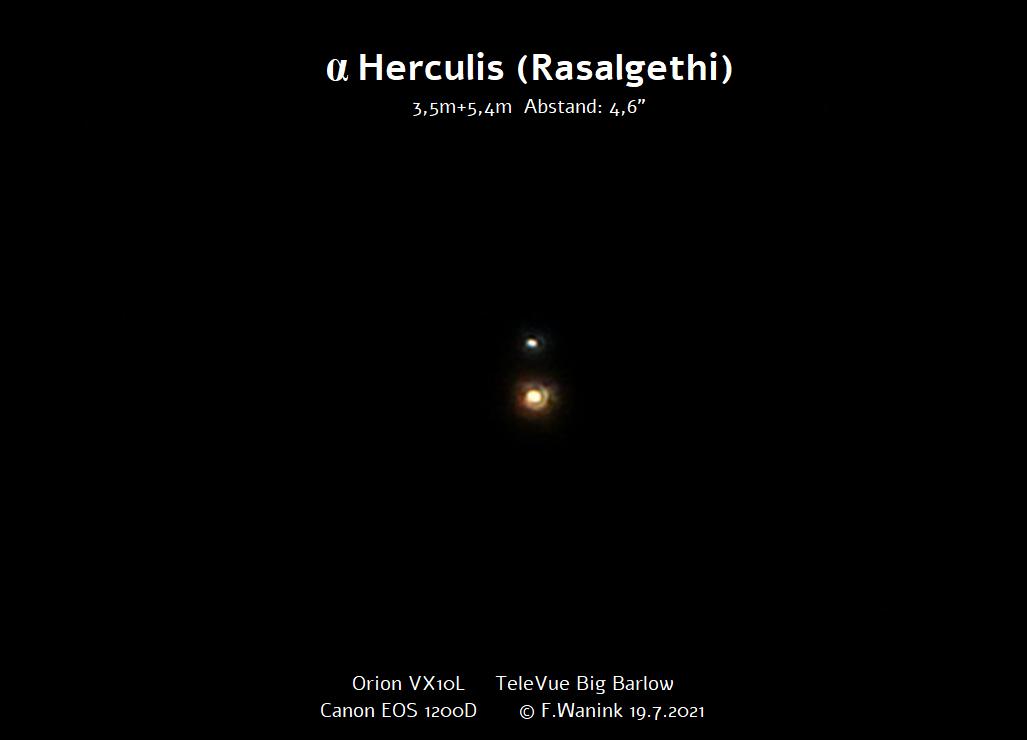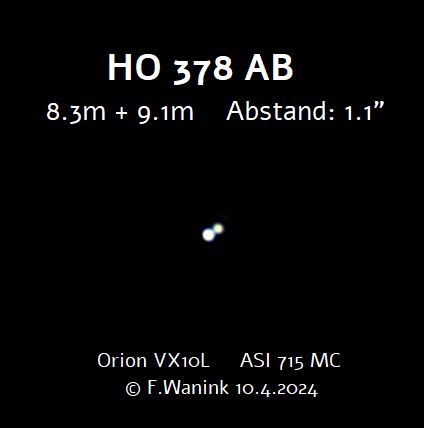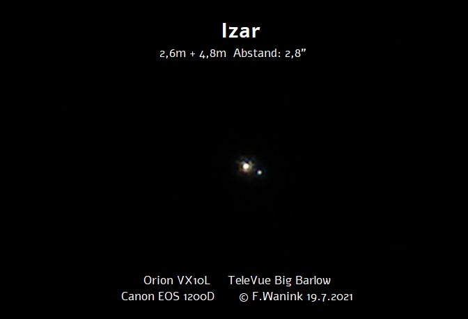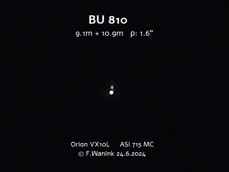 AB: 20x reicht zwar schon für eine klare Trennung, aber Komponente B im Osten ist nur dumpf grau-blau und noch zu schwach für den schönen Farbkontrast, der sich bei 32x offenbart - Komponente A strahlt dann in einem satten Bernsteingelb, B im Osten gibt sich unterkühlt bläulich - Helligkeitsunterschied 1 bis 1.5 Größenklassen, schwierig abschätzbar wegen der Farben |