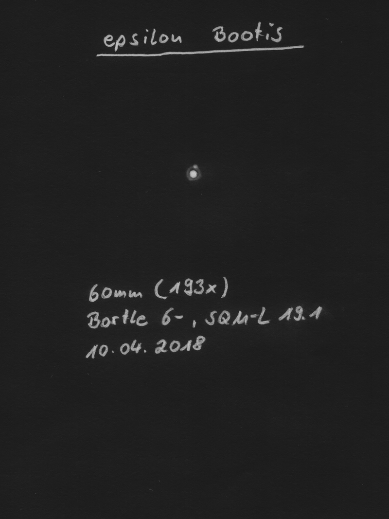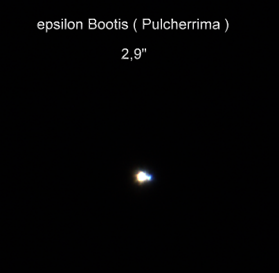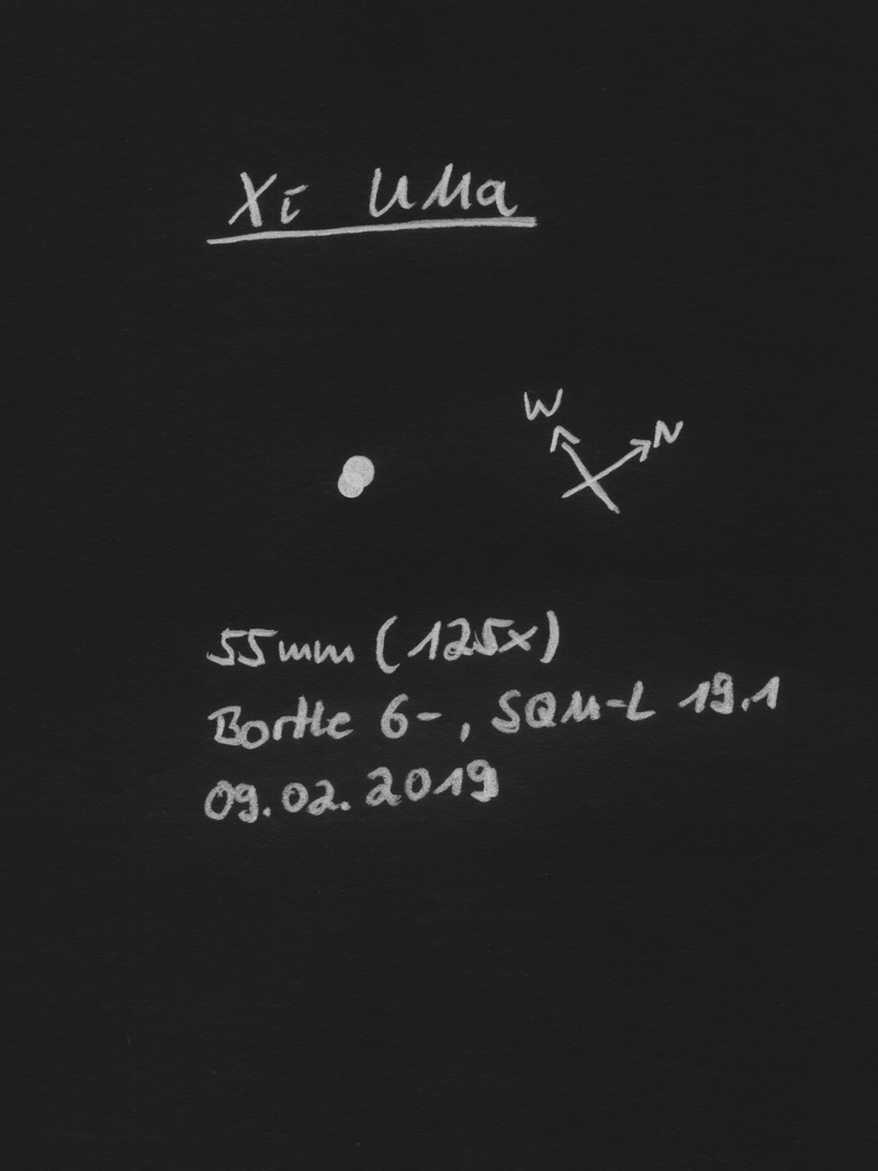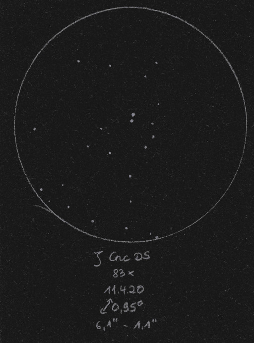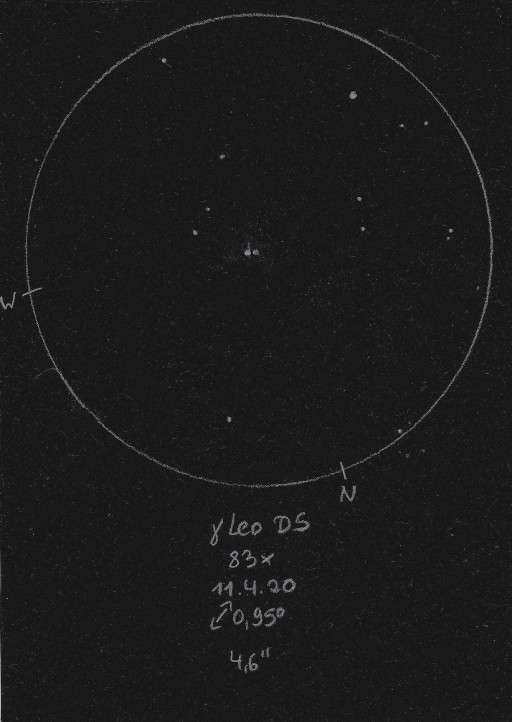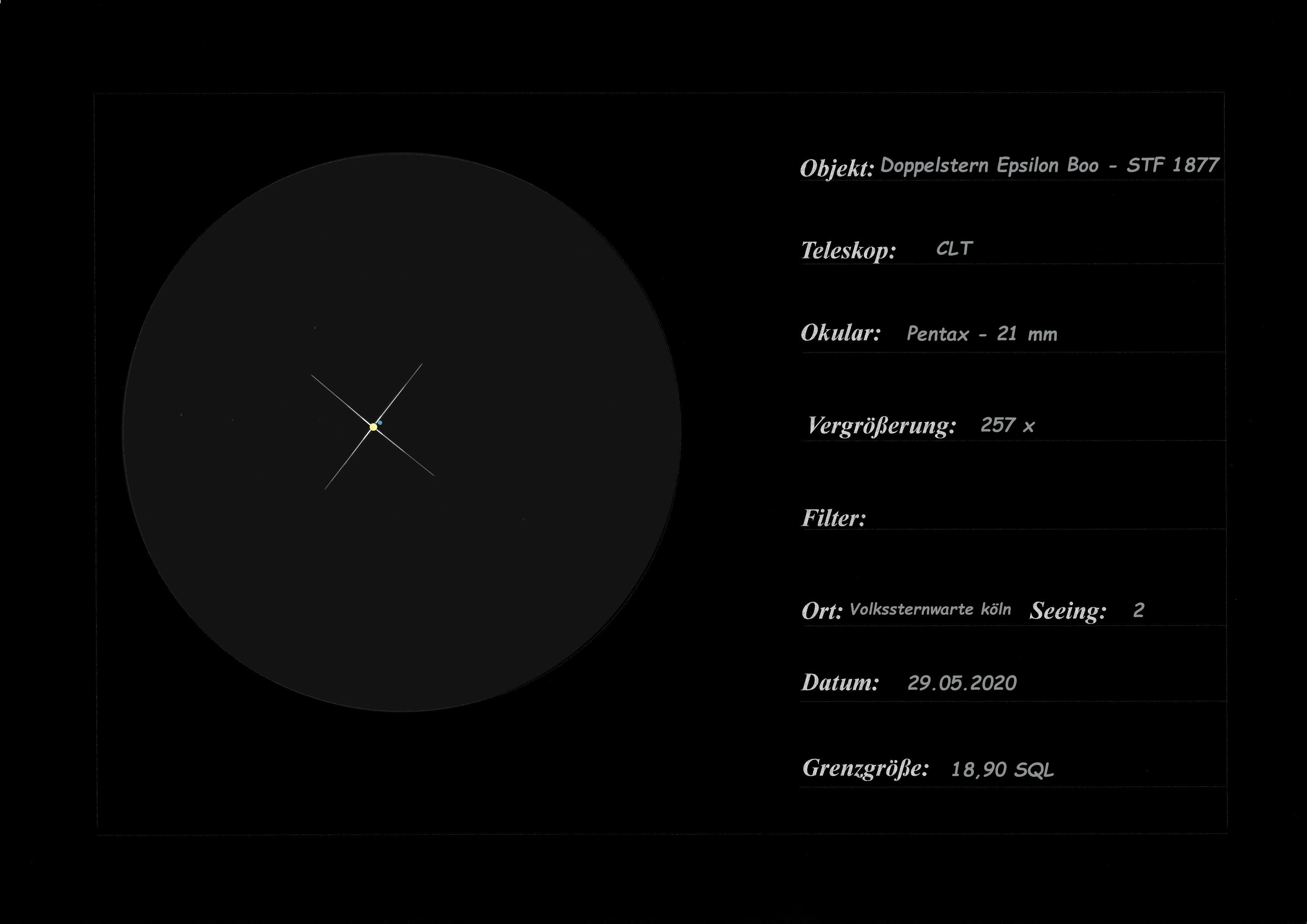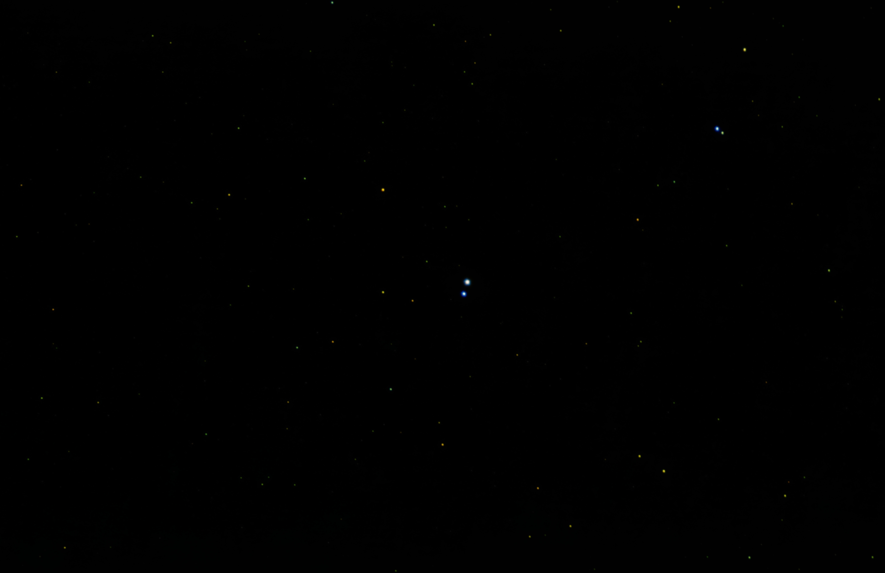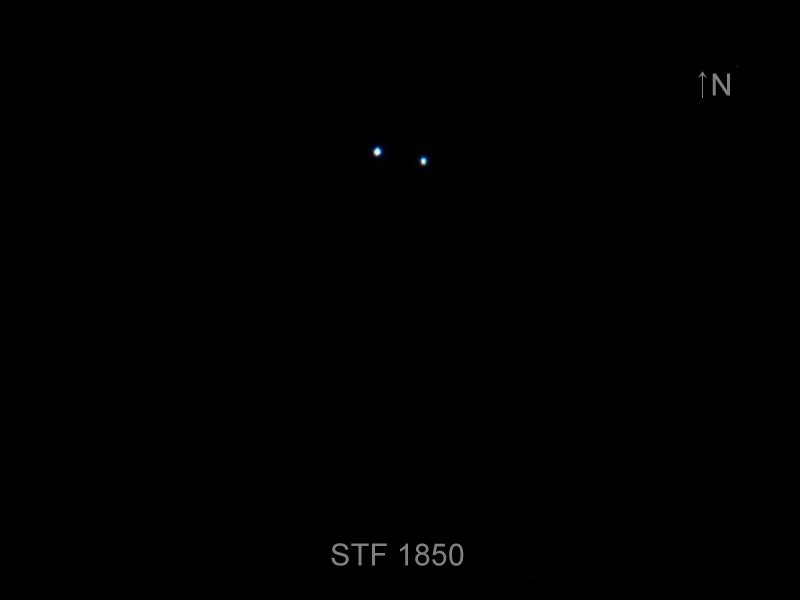 bei 32x ist Komponente B weit getrennt westlich von A zu erkennen - B ist sehr schwach (kommt mir schwächer vor als 8.88 mag laut Stelle Doppie), Helligkeitsunterschied gut 3 Größenklassen (2,27 mag laut Stelle Doppie) - zurück auf 20x ist B noch immer gerade so erkennbar - beide sind allerdings nur noch als Doppelstern mit dem Wissen darüber erkennbar |