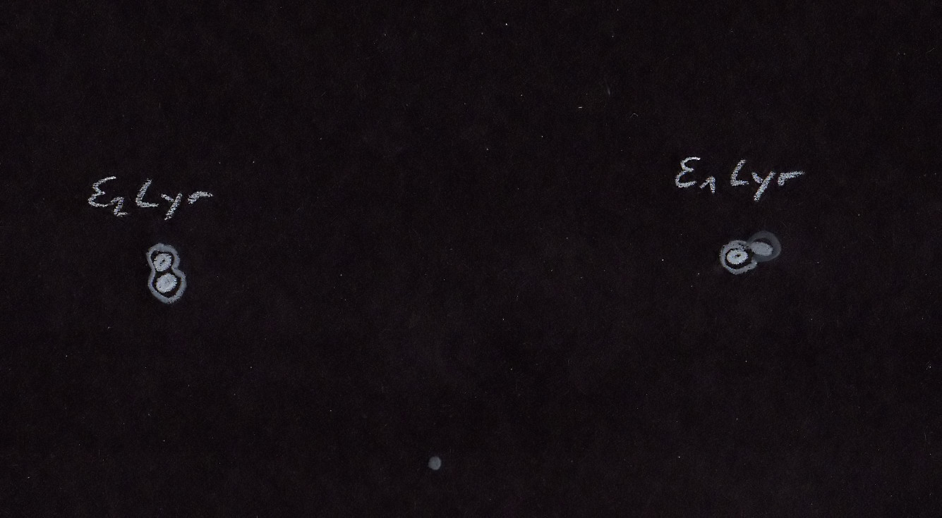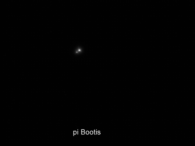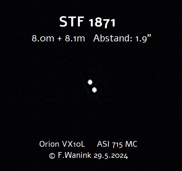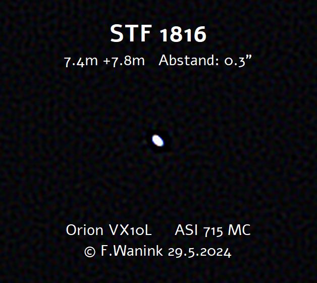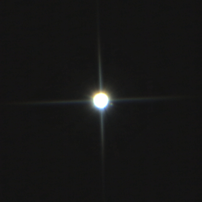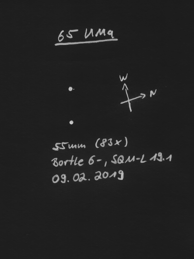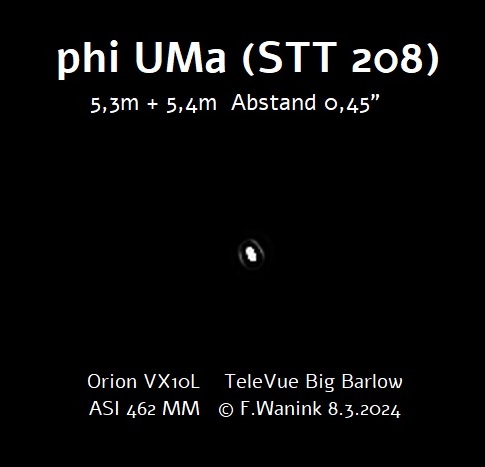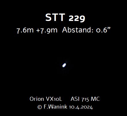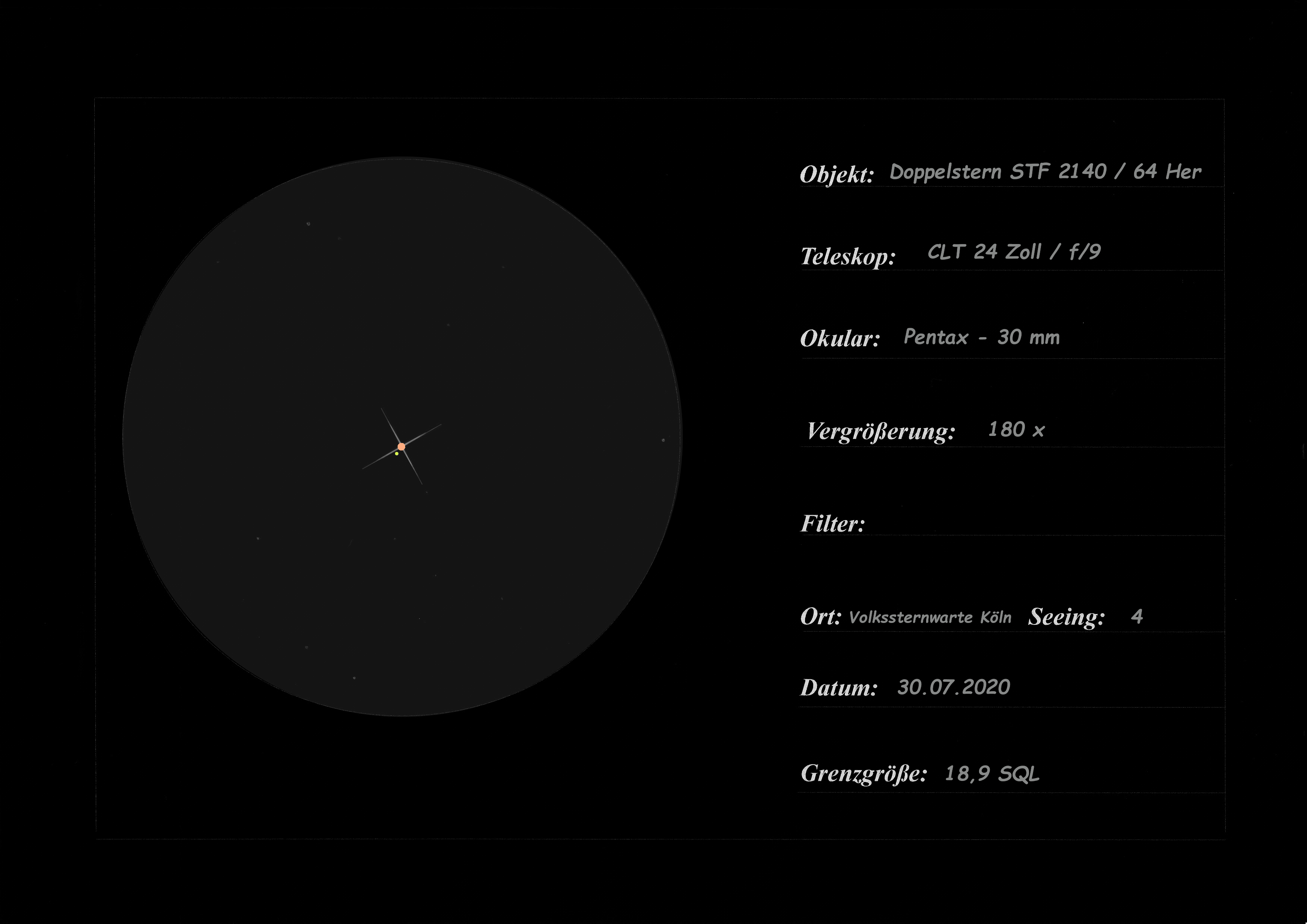 bei 32x ist Komponente B weit getrennt westlich von A zu erkennen - B ist sehr schwach (kommt mir schwächer vor als 8.88 mag laut Stelle Doppie), Helligkeitsunterschied gut 3 Größenklassen (2,27 mag laut Stelle Doppie) - zurück auf 20x ist B noch immer gerade so erkennbar - beide sind allerdings nur noch als Doppelstern mit dem Wissen darüber erkennbar |