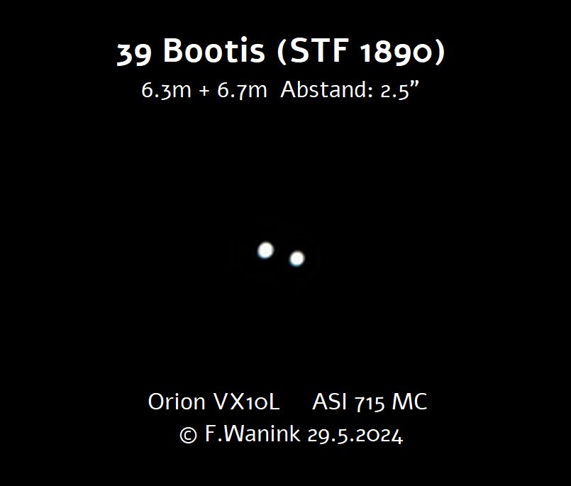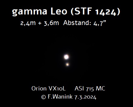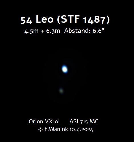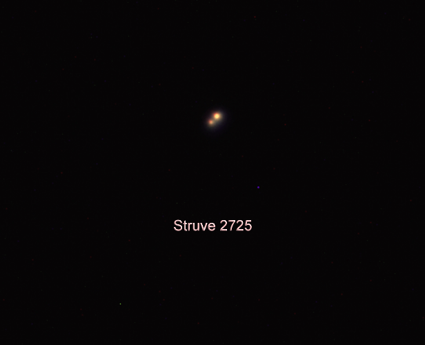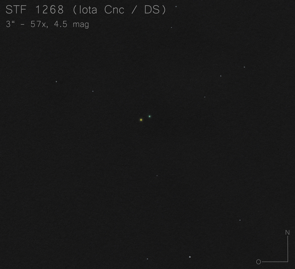 ein schicker Doppelstern, bei 45x bereits trennbar - Komponente B im Südosten ist eine knappe Größenklasse schwächer - das Pärchen zeigt einen Farbkontrast, den ich aber nicht wirklich festmachen kann, A wirkt mitunter weißgelblich und B ab und an orange, dann wieder grau |