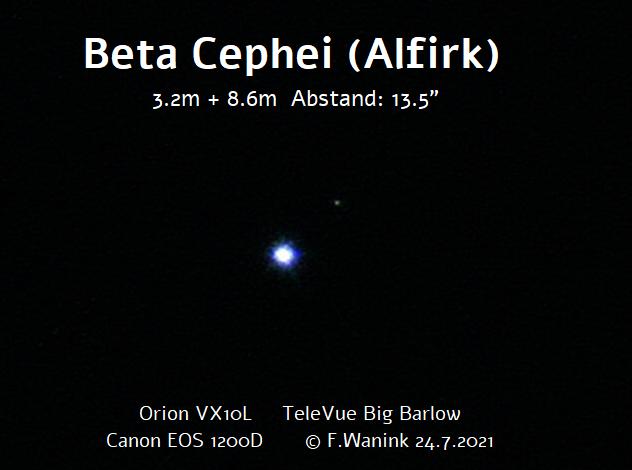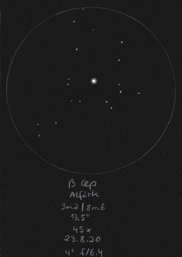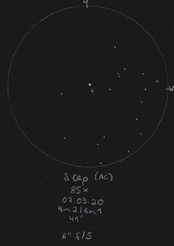 AC: Gerade bei dieser geringen Vergrößerung und somit geringen scheinbaren Abstand der Komponenten erschwert Handzittern die Trennung, aber neben dem orangenen A tanzt eindeutig ein graublauer C. Komponente A ist der Namensgeber der Veränderlichen-Klasse der Delta-Cepheiden, mit einer Helligkeitsspanne von einer ganzen Magnitude und einer Periode von 5 Tagen. Um eine Fernglas-Grenzbeobachtung einordnen zu können, wäre eine genaue Bestimmung der aktuellen Helligkeit von A nötig; ich hatte jedoch momentan kein Teleskop zur Hand. |