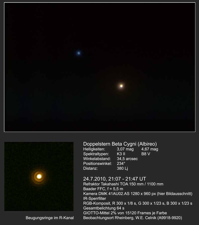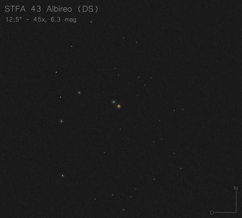 AC: Deutlicher Helligkeits- und Farbunterschied. Hellere Komponente leicht orange, schwächere bläulich. Könnte der kleine Bruder von Albireo sein ;) |
