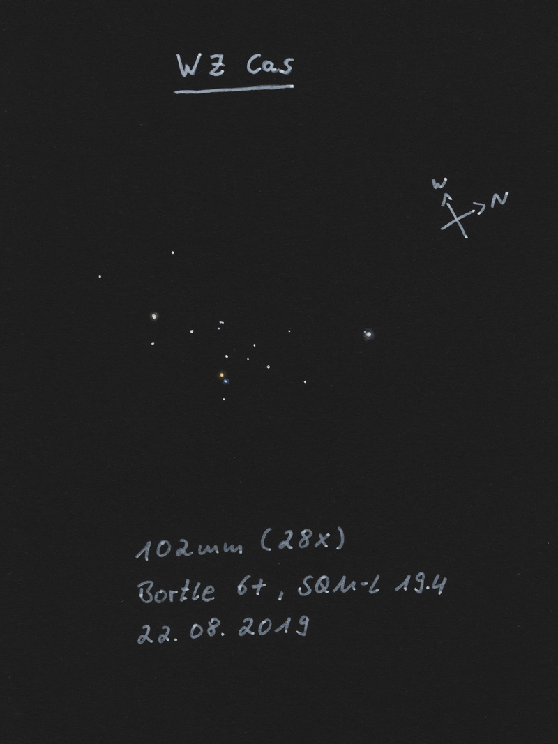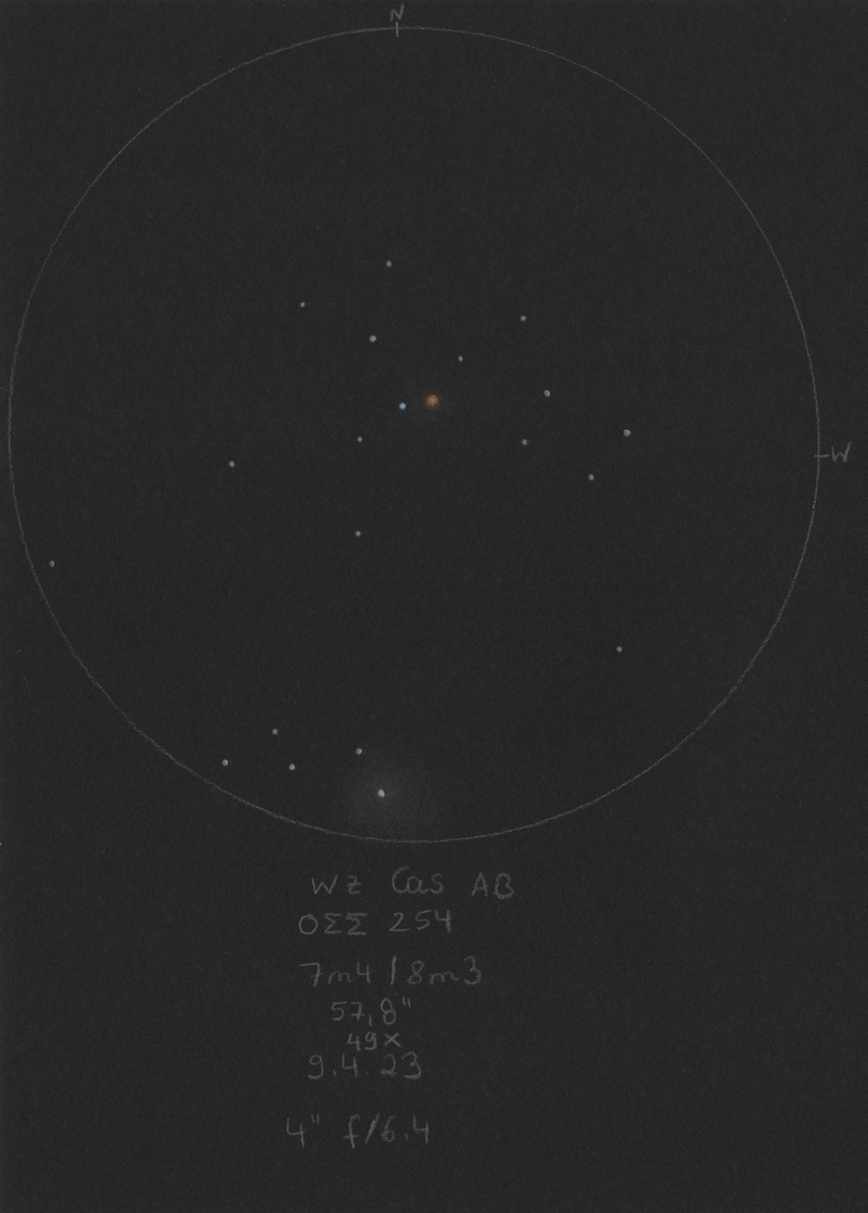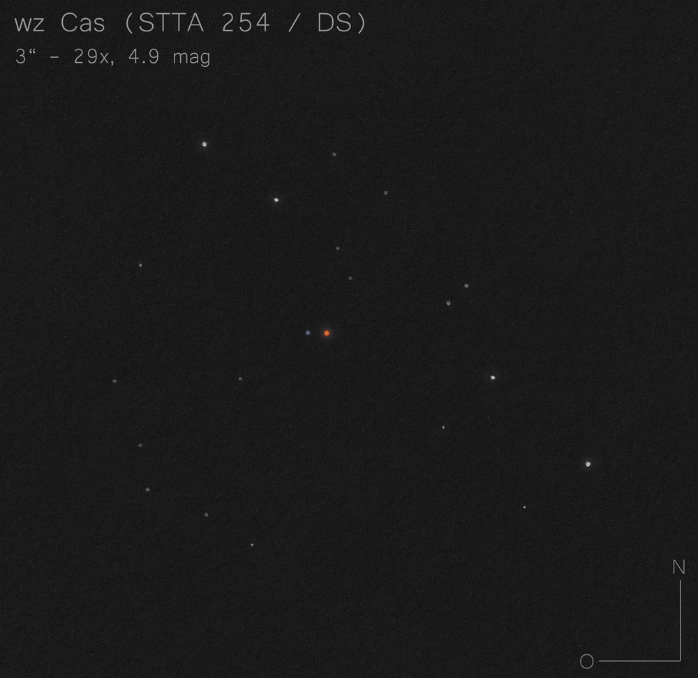 AB: Klar getrennt. A eindeutig heller als B. Unter fst 5m5 Himmel wirken beide Komponenten in diesem Mini-Fernglas schwach und es will kein Farbeindruck aufkommen. WZ Cas ist die Veränderlichen-Bezeichnung von Komponente A. Dieser halbregelmäßig veränderlicher Kohlenstoffstern hat eine mittlere Helligkeitsspanne von 6m8 bis 7m7, mit Extremwerten von 6m3 bis 8m8. Vielleicht war er gerade zu tief im Minimum, um mit 1 Zoll Öffnung Farbe zu zeigen? 15x45 Fernglas zeigte zeitgleich Farbe, siehe Beobachtung. |