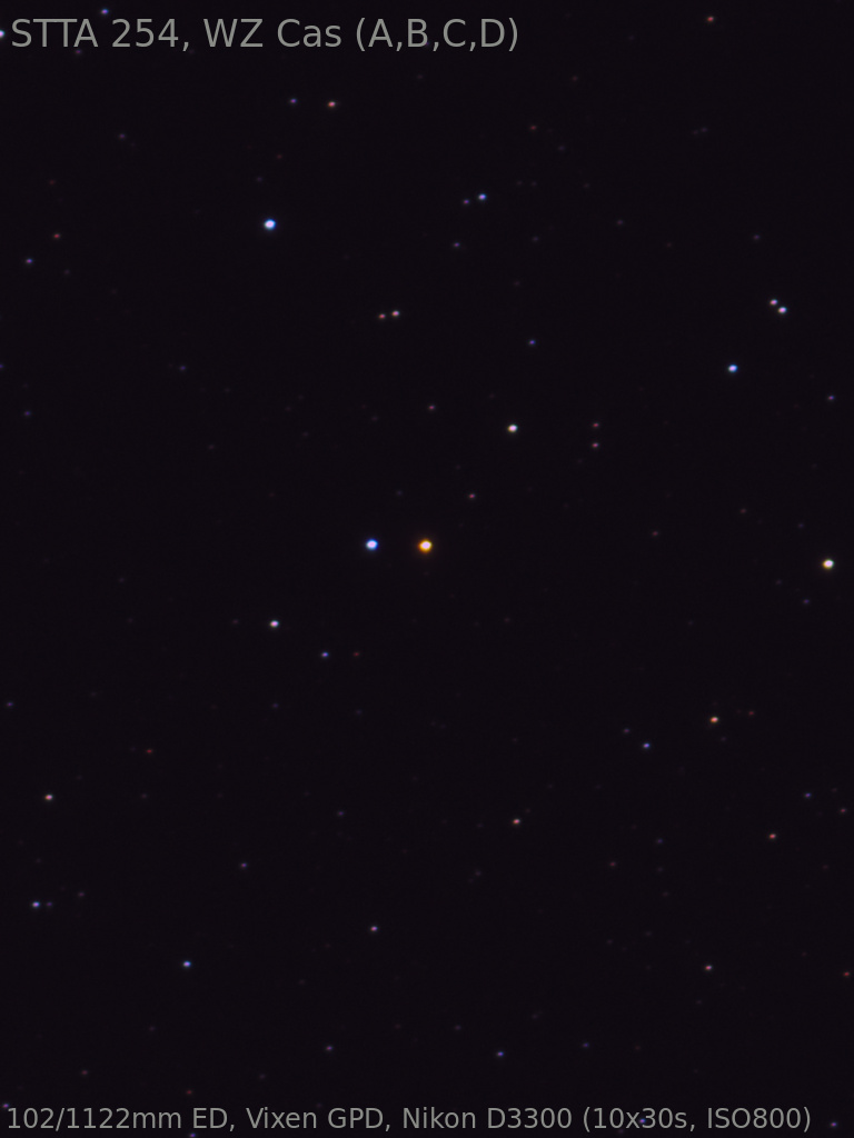 AB: WZ Cas: Pretty, deep orange A and very wide half delta mag B, white. |