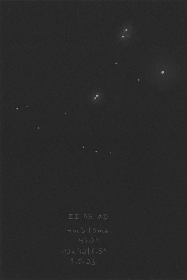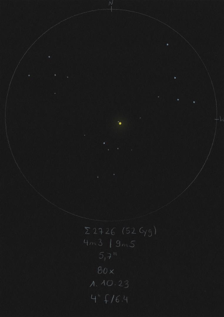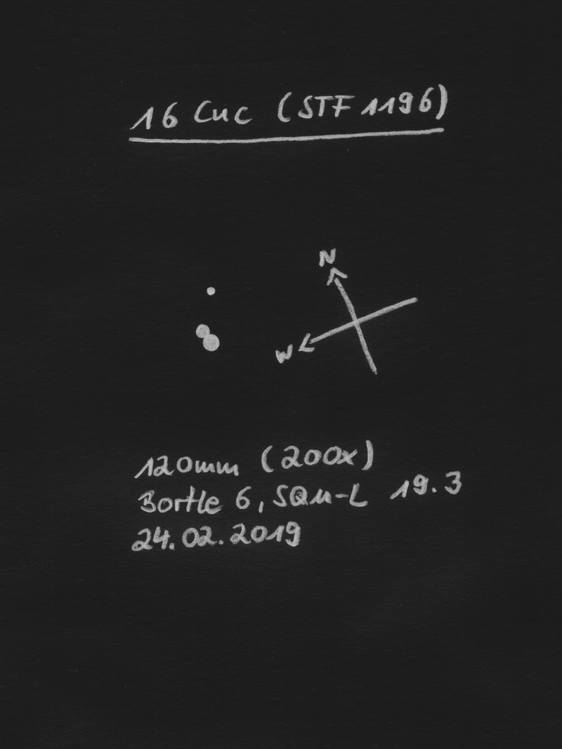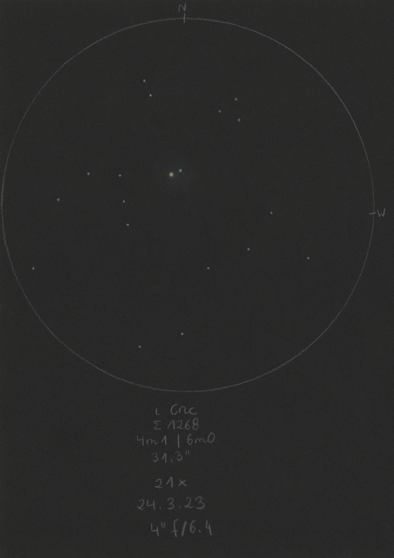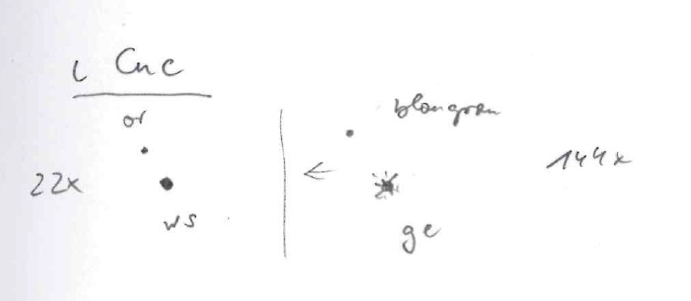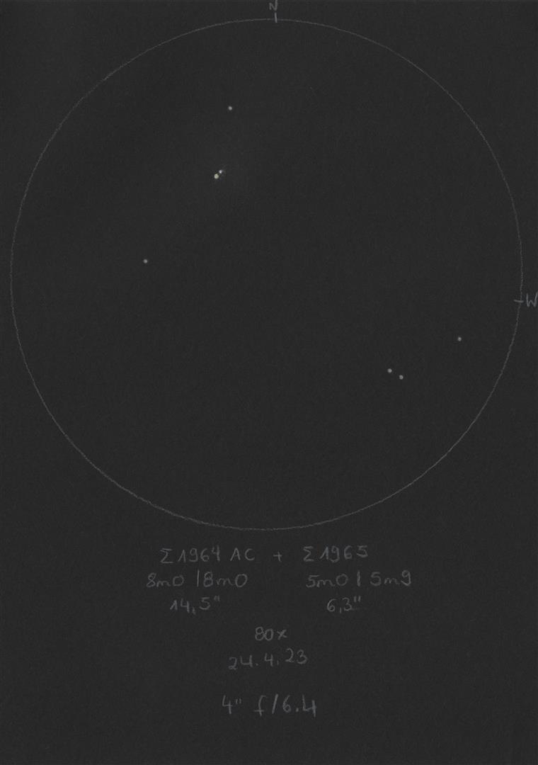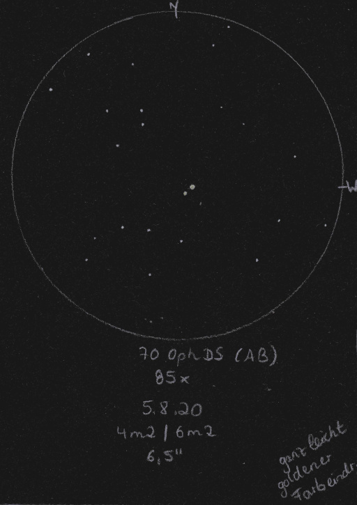 AC: bei 30x ein sehr auffälliges Sternpaar mit einem auffälligen Farbkontrast - auch wenn C deutlich schwächer ist, so strahlen doch beide Sterne um die Wette - Komponente A zeigt sich Siennagelb, C wirkt Blauweiß - ordentliche Trennung - bei 6x ändert C ein wenig seine Farbe, ich habe mitunter den Eindruck, Grünblau zu sehen |
