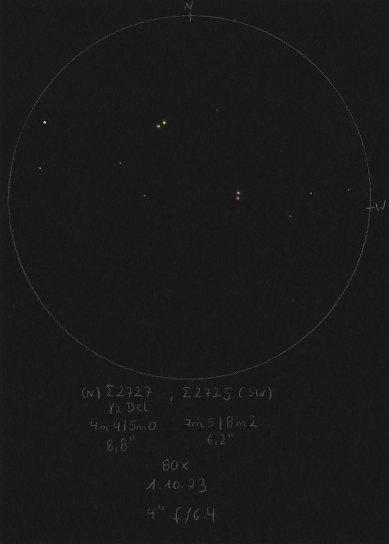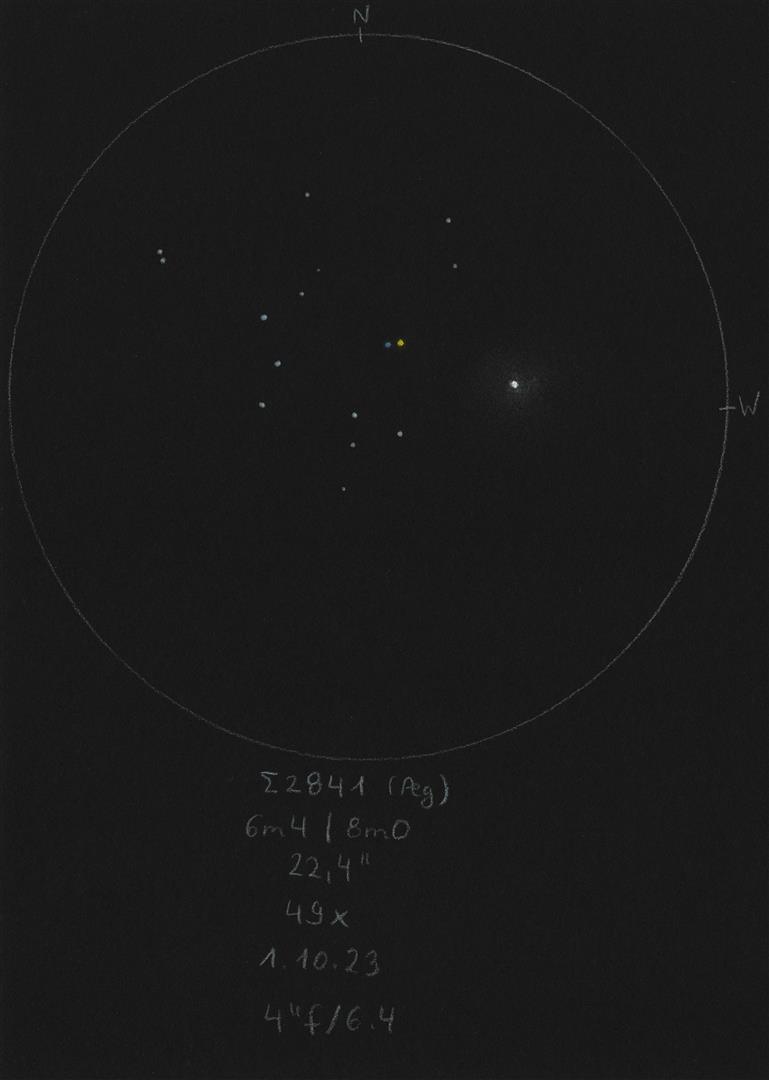 AB: 25.09.23: mit 21-fach schon getrennt zu sehen, im Südwesten strahlt eine zart goldfarbene A-Komponente und dicht daran im Nordosten steht ein ganz graues Lichtpünktchen mit einem Hauch eines metallischen Farbglanzes |