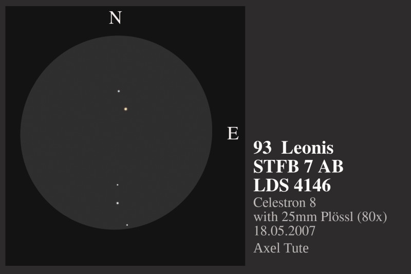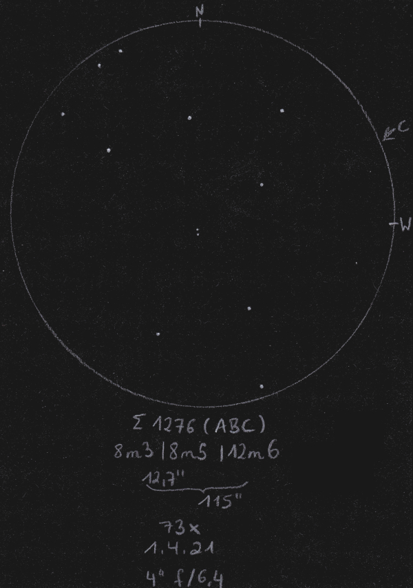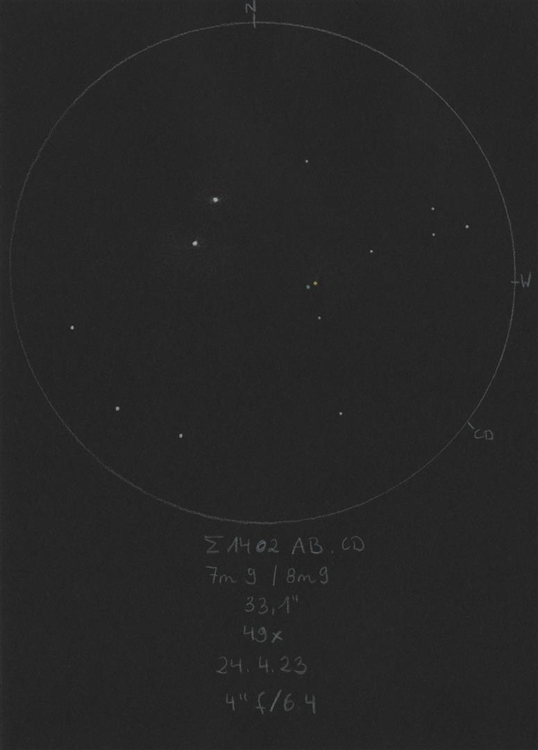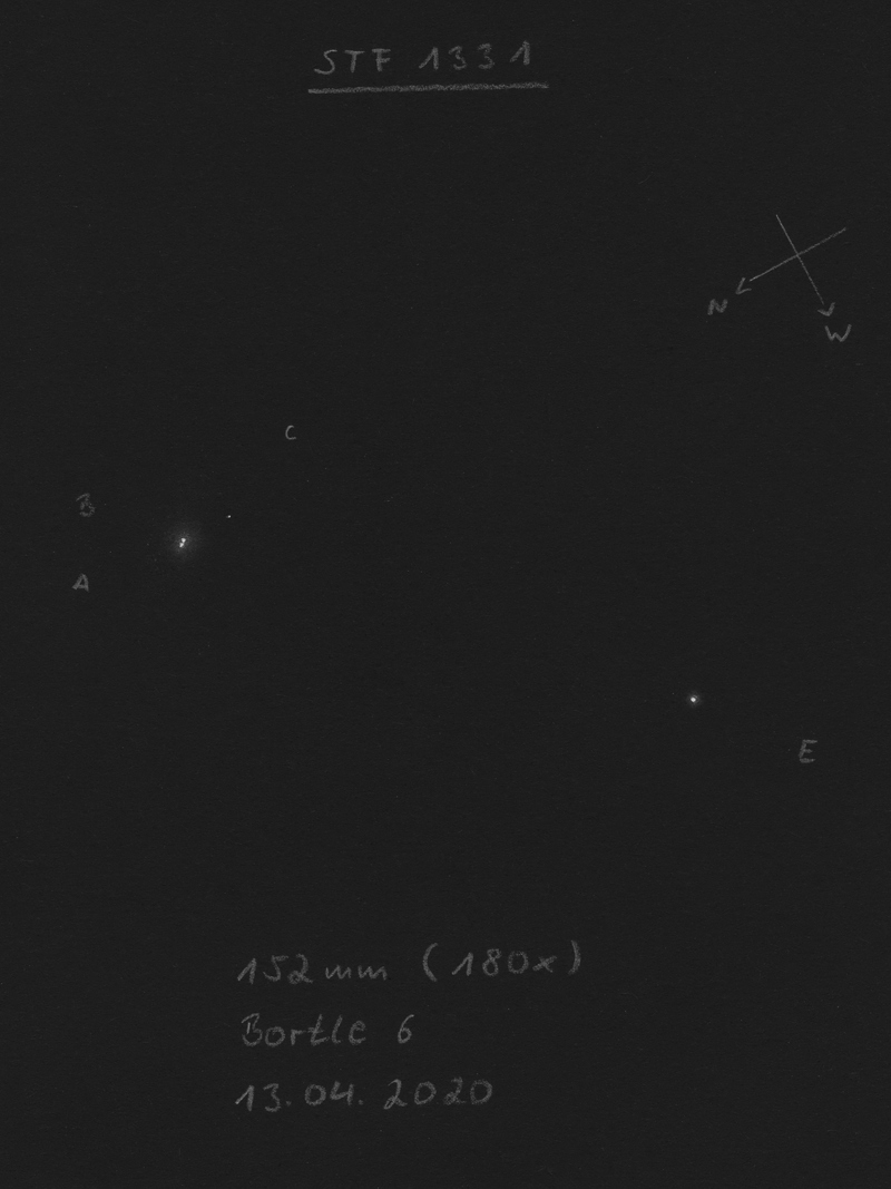 AB-D: 05.04.2020: Sofort auffällig im Feld. Mittelheller Doppelstern mit leicht ungleichen Komponenten. Westliche Komponente AB schien leicht orange, die Komponente D tendierte zum Bläulichen. |