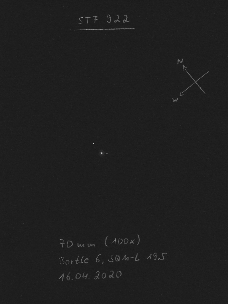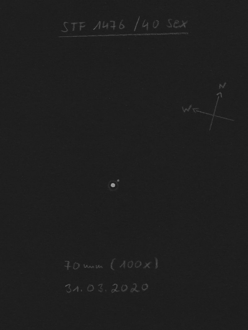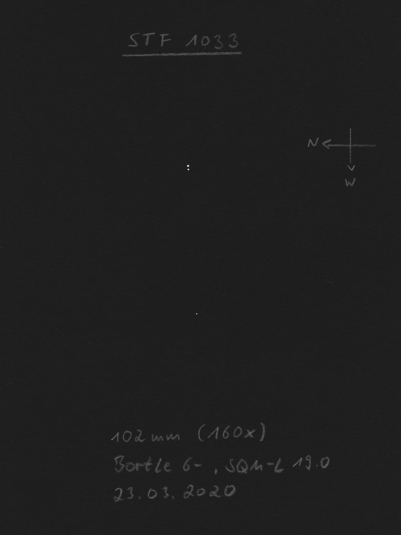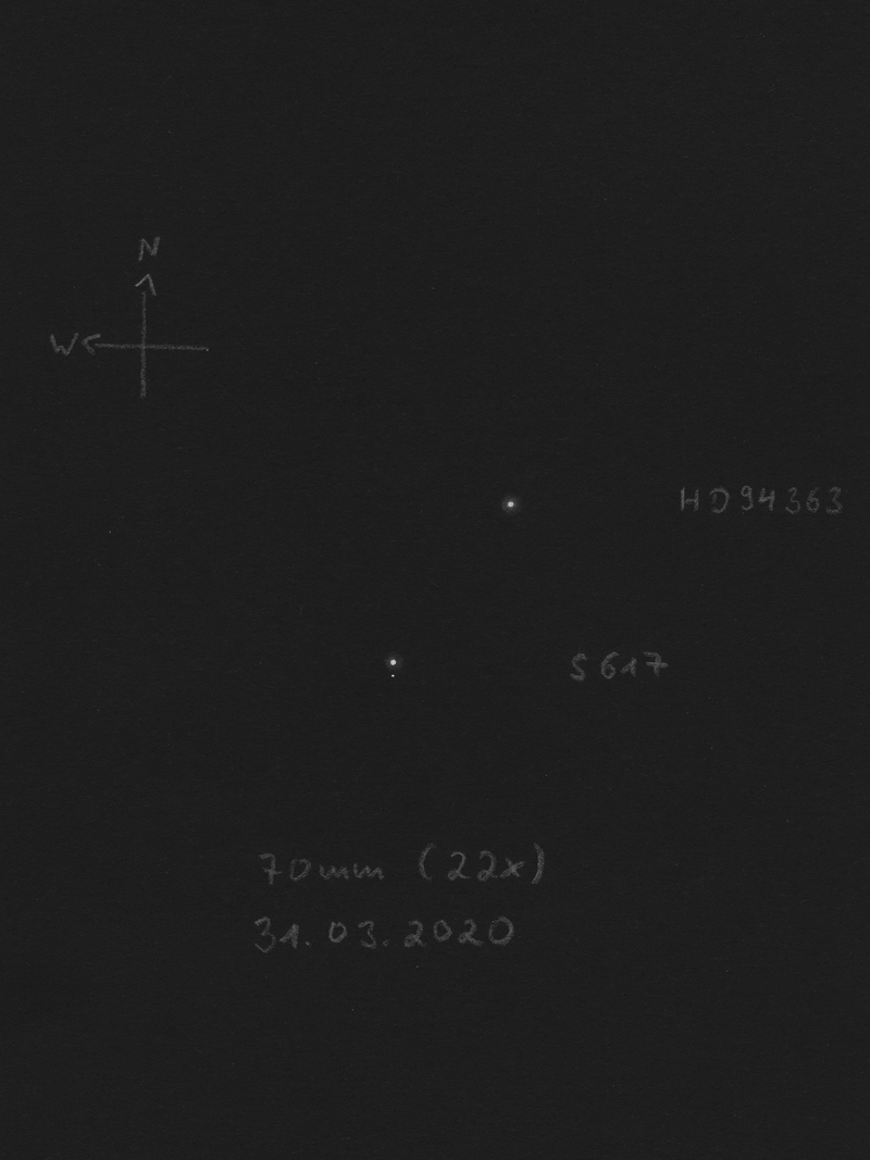 02.03.2021: Getrennt, aber sehr dicht zusammenstehend und recht großem Helligkeitsunterschied. Der Begleiter erscheint nur als sehr schwaches Sternchen. |