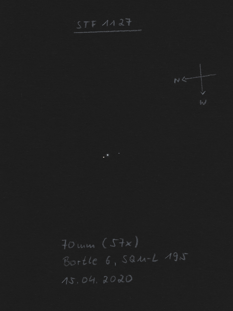 Handgehalten. In guten Momenten deutlich getrennt. Trennung etwas schwierig im handgehaltenen Fernglas bei 7x unter meinem FST 5m0 Himmel. Auf Stativ oder unter marginal besserem Himmel vermutlich ein hübsches, gleichmäßiges Paar. Ein physikalischer Doppelstern in 132 Lichtjahren Abstand zu uns. |