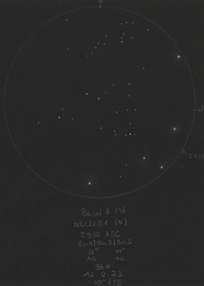 Selbst bei hoher Vergrößerung keine Anzeichen für einen Doppelstern. Auch kam mir die Helligkeit geringer vor als angegeben!? |