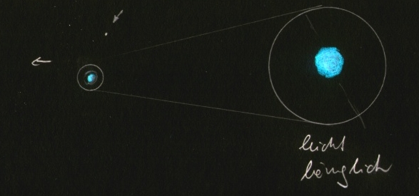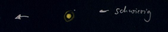 AB-D: Einfach trennbar bei großem Abstand und sehr geringem Helligkeitsunterschied. Die D-Komponente zeigte Tendenz ins Bläuliche, die hellere (AB) minimal gelblich. Bei hoher Vergrößerung ist dann auch die schwache C-Komponente erkennbar. |