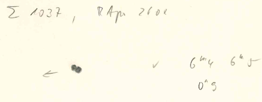 bei 64x extrem weit getrennt, Komponente B im Norden ist mindestens 3 Größenklassen schwächer - A wirkt cremeweiß, B ist eine graue Maus - kaum weitere Sterne im unmittelbaren Umfeld |