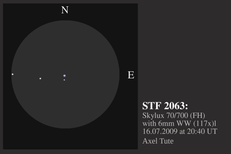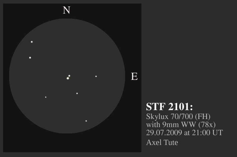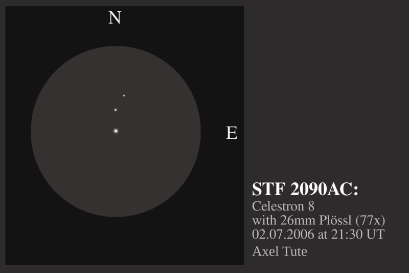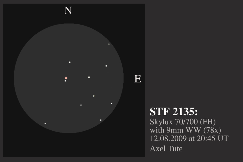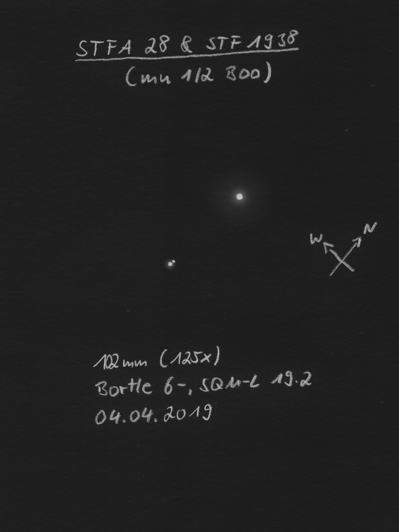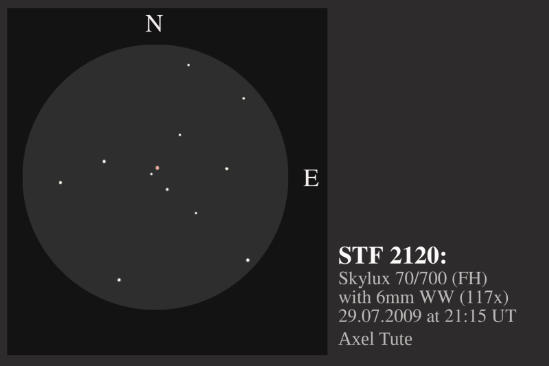 AB: 02.03.2021: Eher schwacher Doppelstern mit gut sichtbarer Helligkeitsdifferenz und moderatem Abstand. Leicht orange & grau-bläulich. Nördlich im gleichen Gesichtsfeld befindet sich der auffällige Doppelstern STTA 116. |