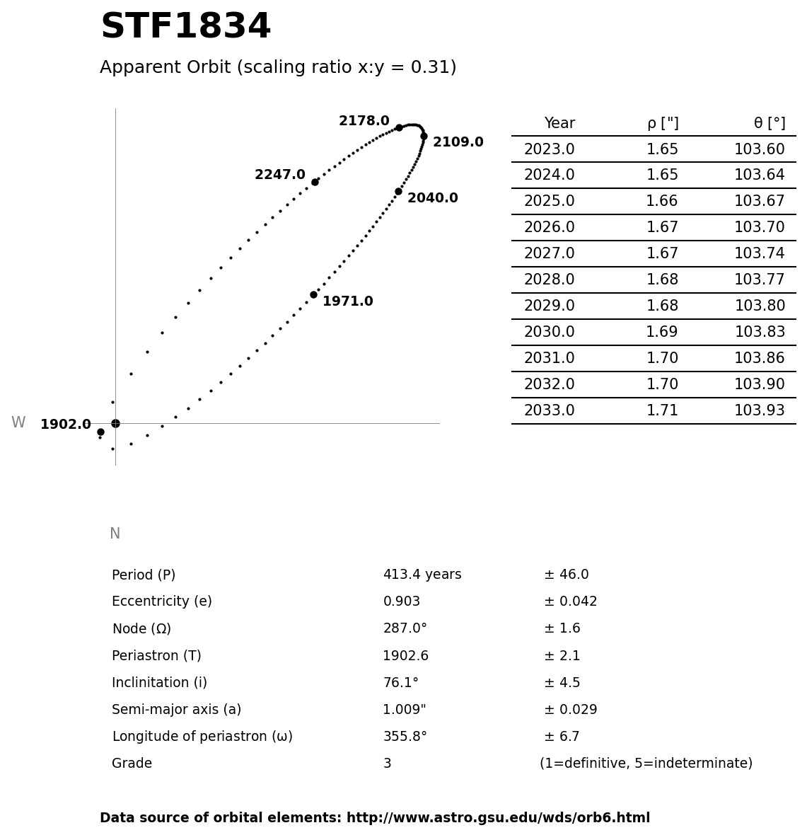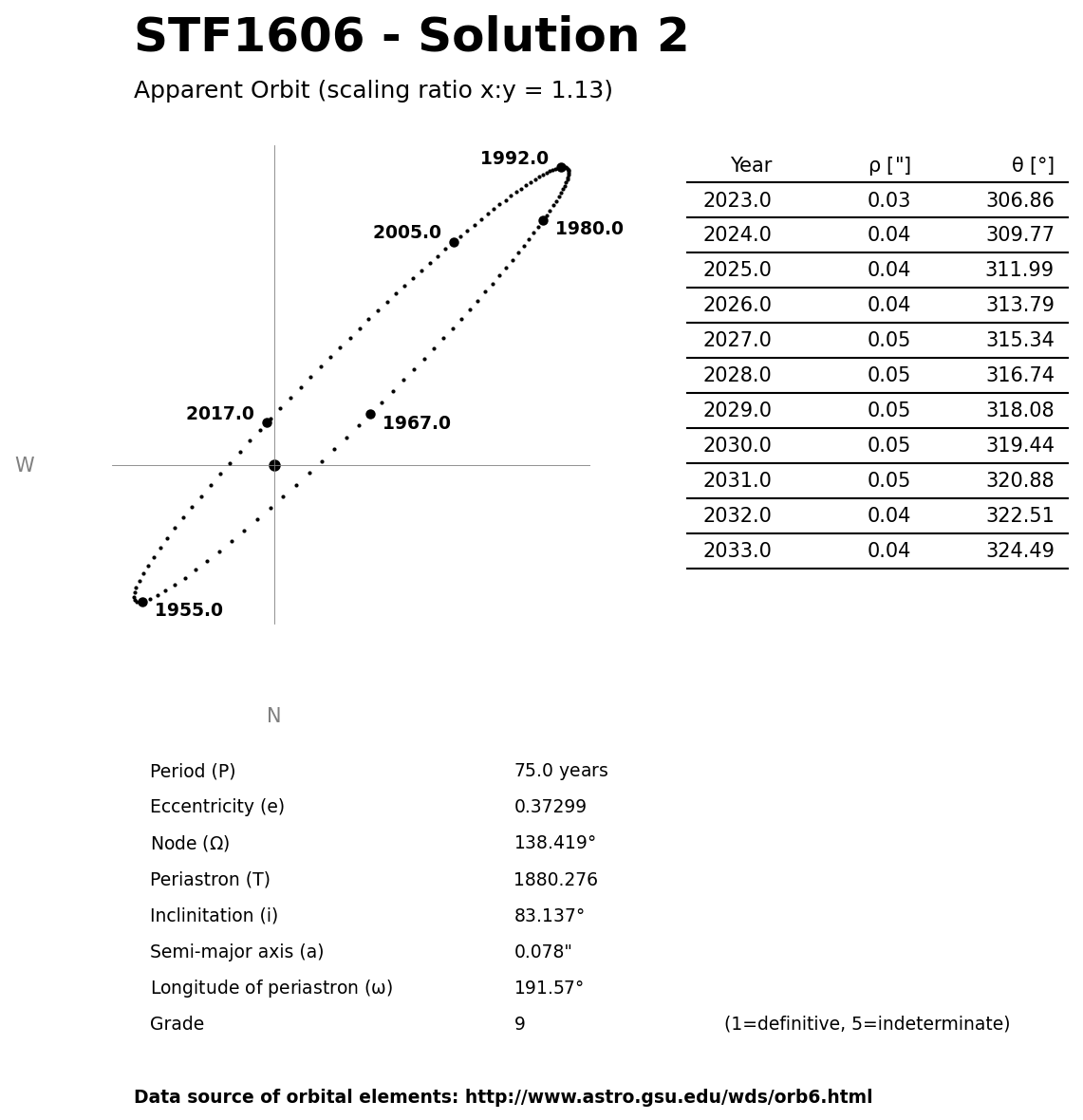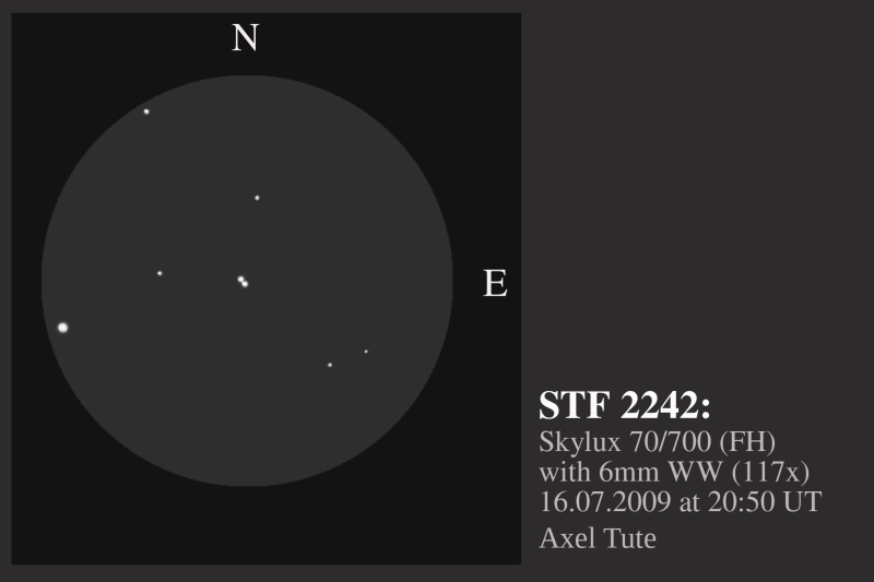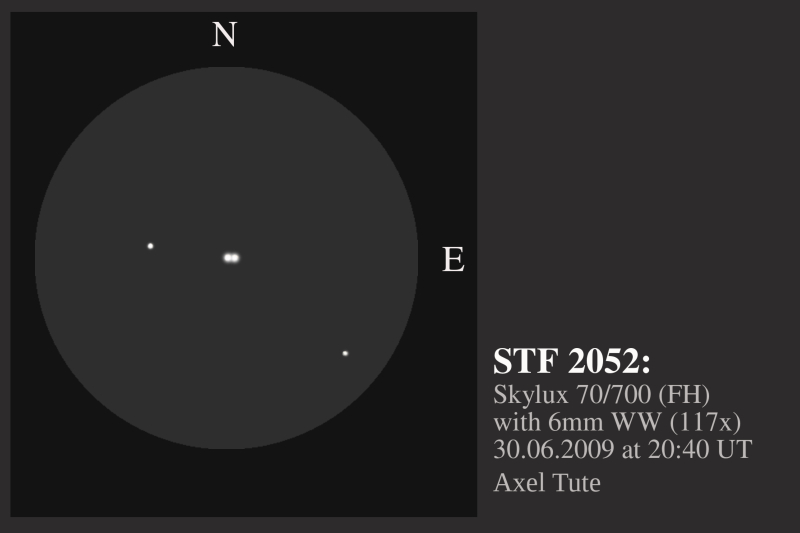 AB: 02.03.2021: Eher schwacher Doppelstern mit gut sichtbarer Helligkeitsdifferenz und moderatem Abstand. Leicht orange & grau-bläulich. Nördlich im gleichen Gesichtsfeld befindet sich der auffällige Doppelstern STTA 116. |