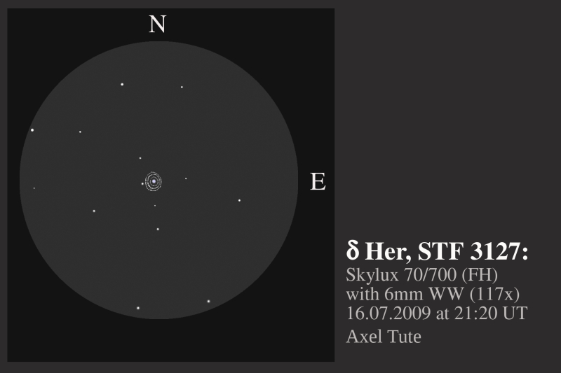Komponente B ist knapp getrennt westlich von A erkennbar - Helligkeitsunterschied eine halbe Magnitude (1.17 mag laut Stelle Doppie) - der Doppelstern muss sich gegen viele helle Sterne im Umfeld durchsetzen, er wirkt dadurch ein wenig verloren, aber auch filigraner |